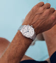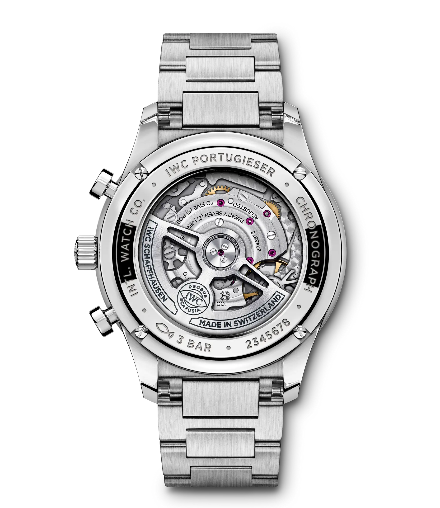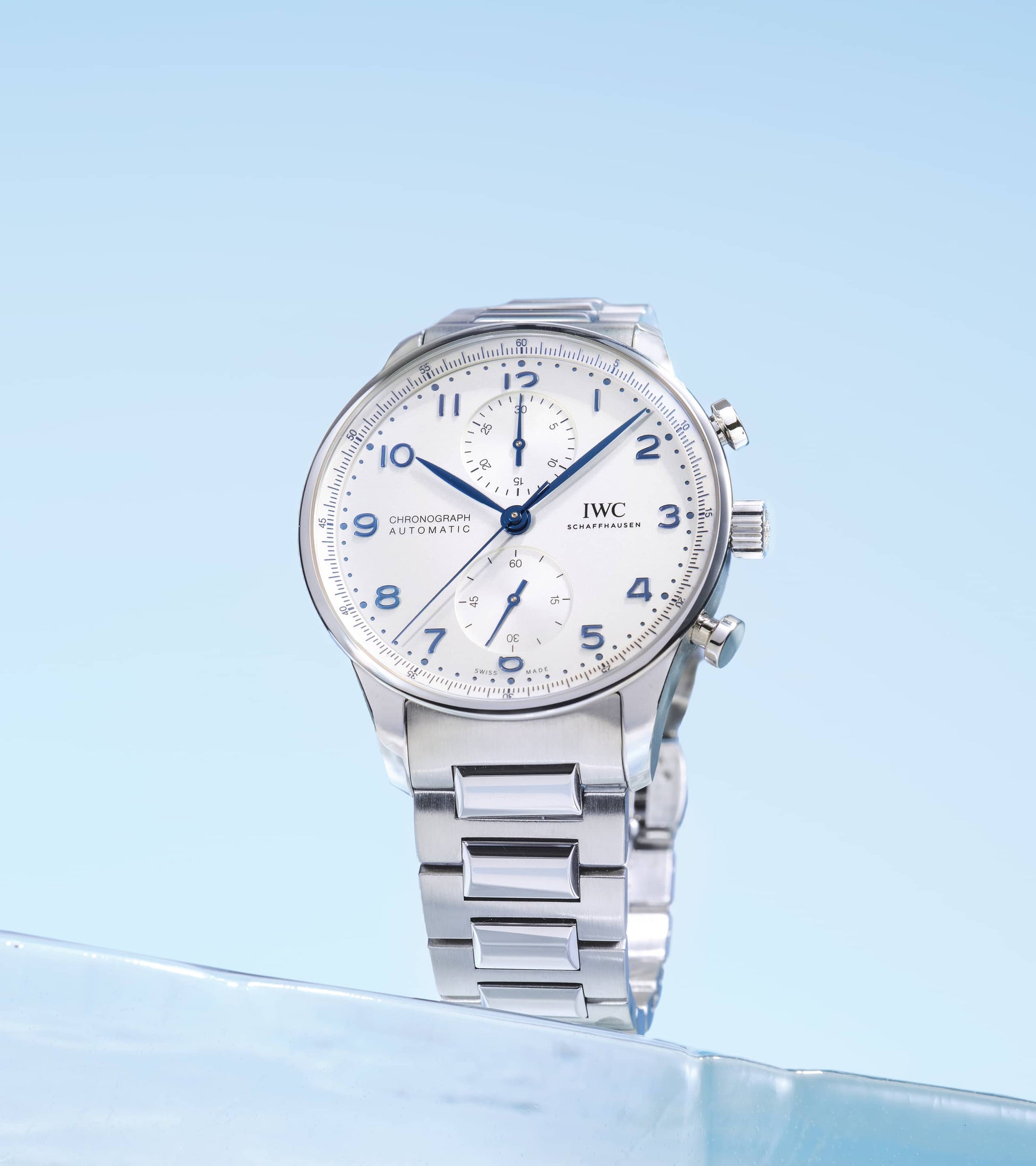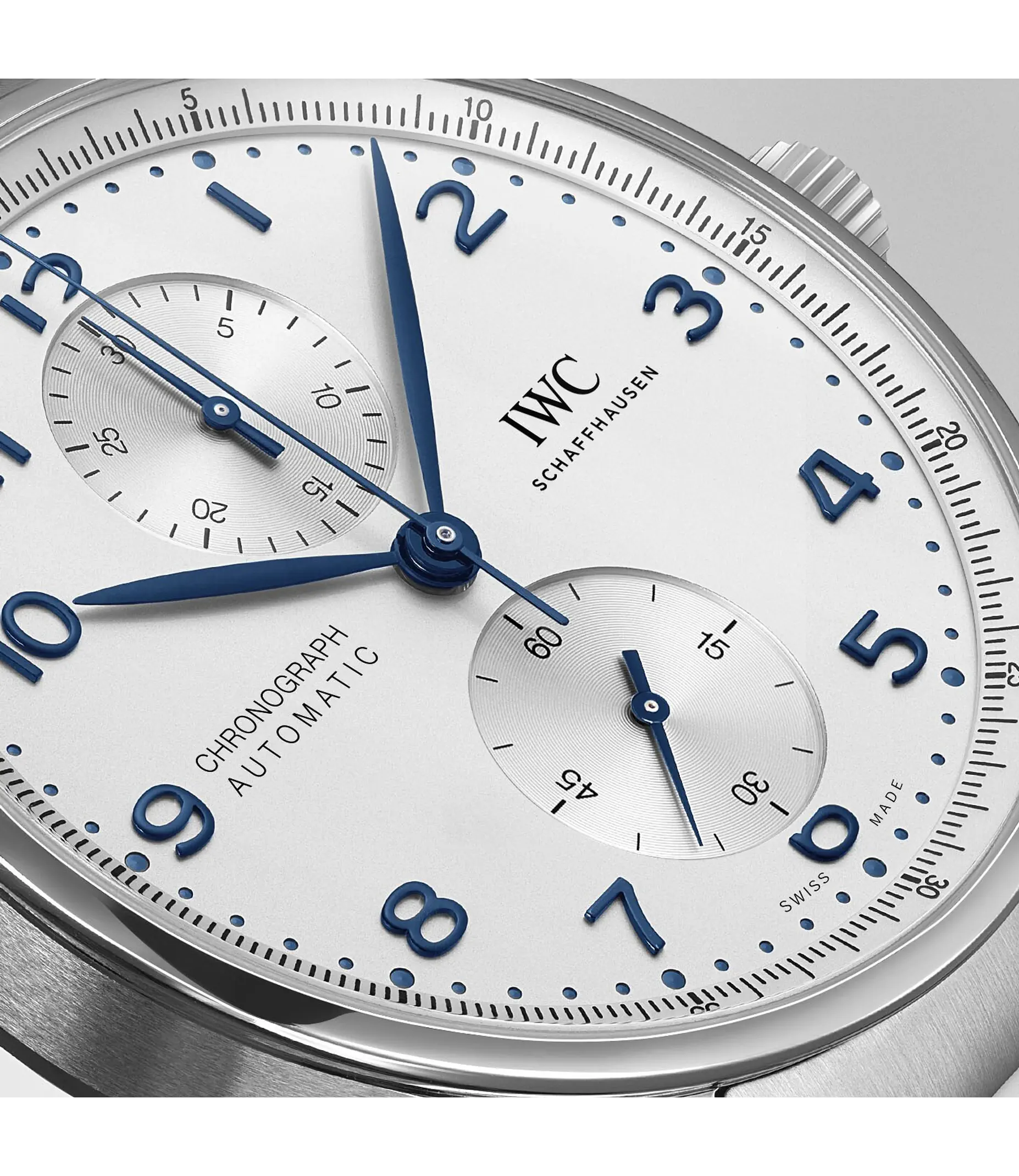 Zum ersten Mal präsentiert IWC die Portugieser Chronograph an einem Edelstahlarmband für einen ergonomischen Sitz am Handgelenk. Ein klares, offenes Zifferblatt mit zwei vertieften Totalisatoren sowie dem mit einer Viertelsekundenskala bedruckte Réhaut: Das ist die Erfolgsformel der Portugieser Chronograph, mit der IWC vor über 20 Jahren eine sportlichere Designvariante in der Portugieser-Familie etabliert hat. Jetzt ist der zeitlos moderne Chronograph zum ersten Mal mit einem Armband aus Edelstahl erhältlich. Es ist wunderschön detailliert und wurde aufwändig mit polierten und satinierten Oberflächen veredelt. Dank der Doppel-Faltschließe sitzt es ergonomisch am Handgelenk und bietet einen ausgezeichneten Tragekomfort. Mit dem robusten und korrosionsbeständigen Edelstahlband wird die Portugieser Chronograph zu einer noch vielseitigeren Begleiterin. Dieses Modell verfügt über ein Gehäuse aus Edelstahl, ein argentéfarbenes Zifferblatt sowie blaue Zeiger und Appliken. Im Inneren arbeitet das IWC-Manufakturkaliber 69355. Das robuste und präzise Chronographenwerk in klassischer Kolonnenradbauweise verfügt über einen automatischen Klinkenaufzug und lässt sich durch einen Sichtboden aus Saphirglas betrachten.