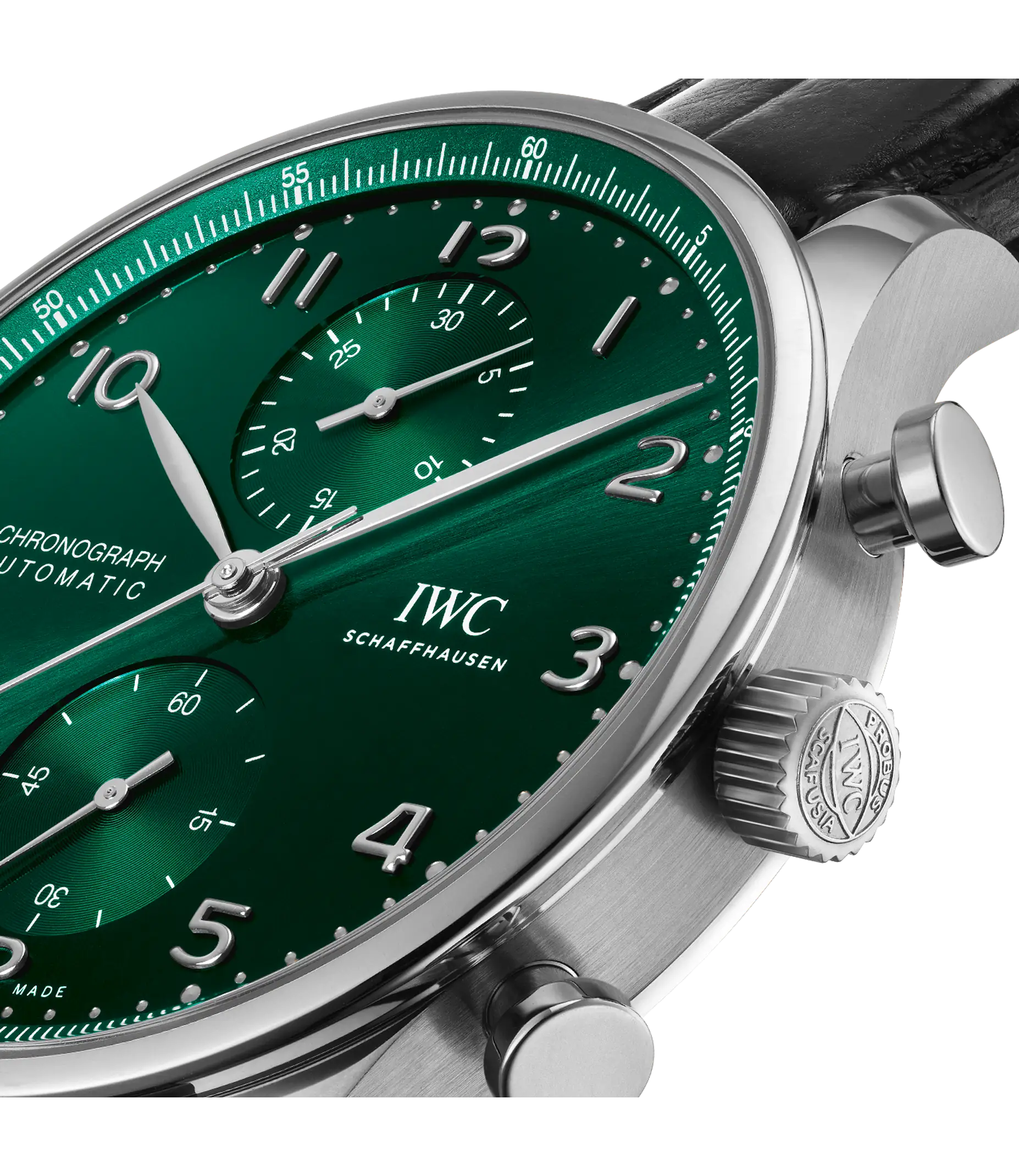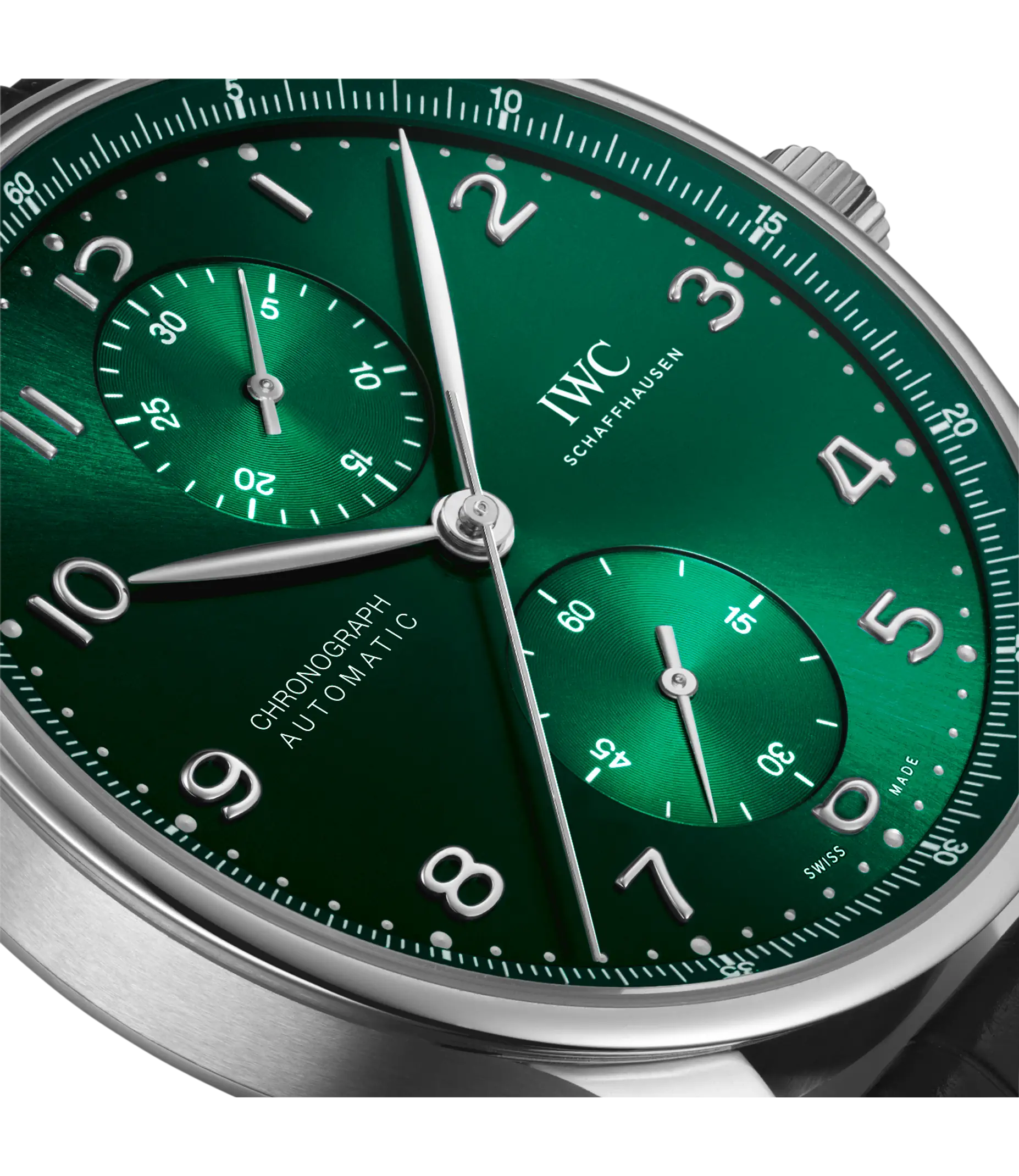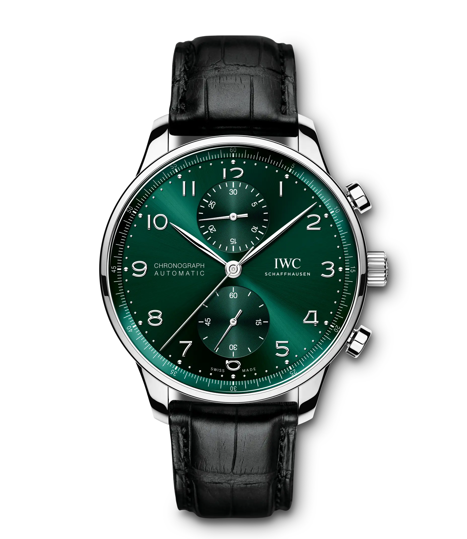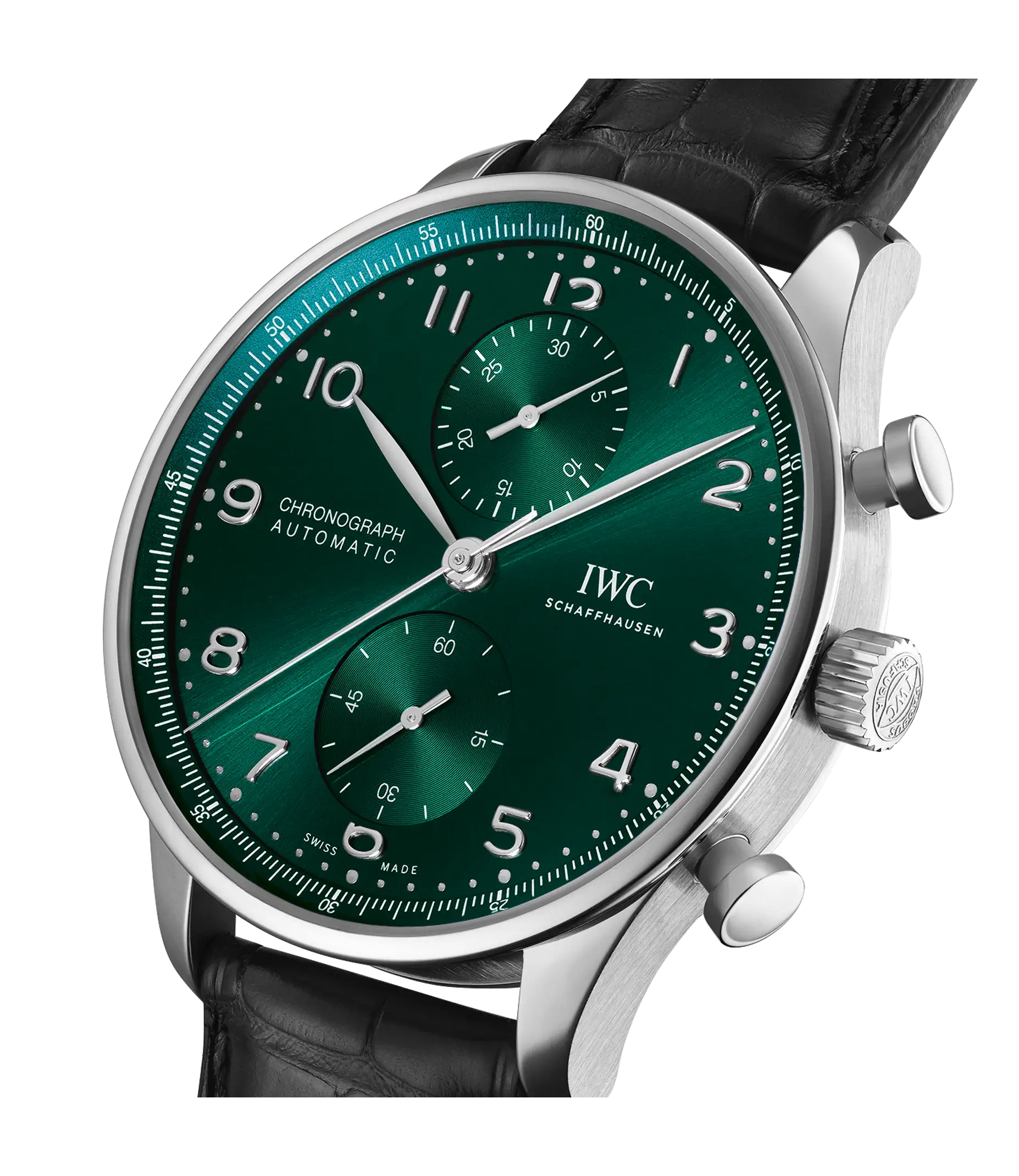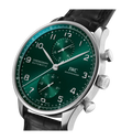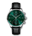 Der Portugieser Chronograph ist eines der ikonischsten Modelle von IWC Schaffhausen. Die harmonisch gestaltete Uhr mit umlaufender Präzisionsskala und vertieften Totalisatoren ist seit 1998 das begehrteste Mitglied der Portugieser-Familie. Mit seinem kompakten Durchmesser von 41mm passt der Chronograph an fast jedes Handgelenk. Durch die filigrane Lünette entsteht der Eindruck, als würde man eine bedeutend größere Uhr tragen. Das klare, funktionale Zifferblatt besticht mit applizierten arabischen Zahlen und schlanken Feuille-Zeigern. Der charakteristische, mit einer Viertelsekundenskala bedruckte Rehaut ermöglicht nicht nur ein präzises Ablesen der Stoppzeit, sondern erinnert auch an den Ursprung der Portugieser als nautisches Präzisionsinstrument für das Handgelenk. Dieses Modell verfügt über ein Gehäuse aus Edelstahl, ein grünes Zifferblatt sowie rhodinierte Zeiger und Appliken. Es wird an einem schwarzen Krokolederband getragen. Im Inneren des sportlich-eleganten Chronographen arbeitet das IWC-Manufakturkaliber 69355. Das robuste und präzise Chronographenwerk in klassischer Kolonnenradbauweise lässt sich durch einen Sichtboden aus Saphirglas betrachten.