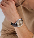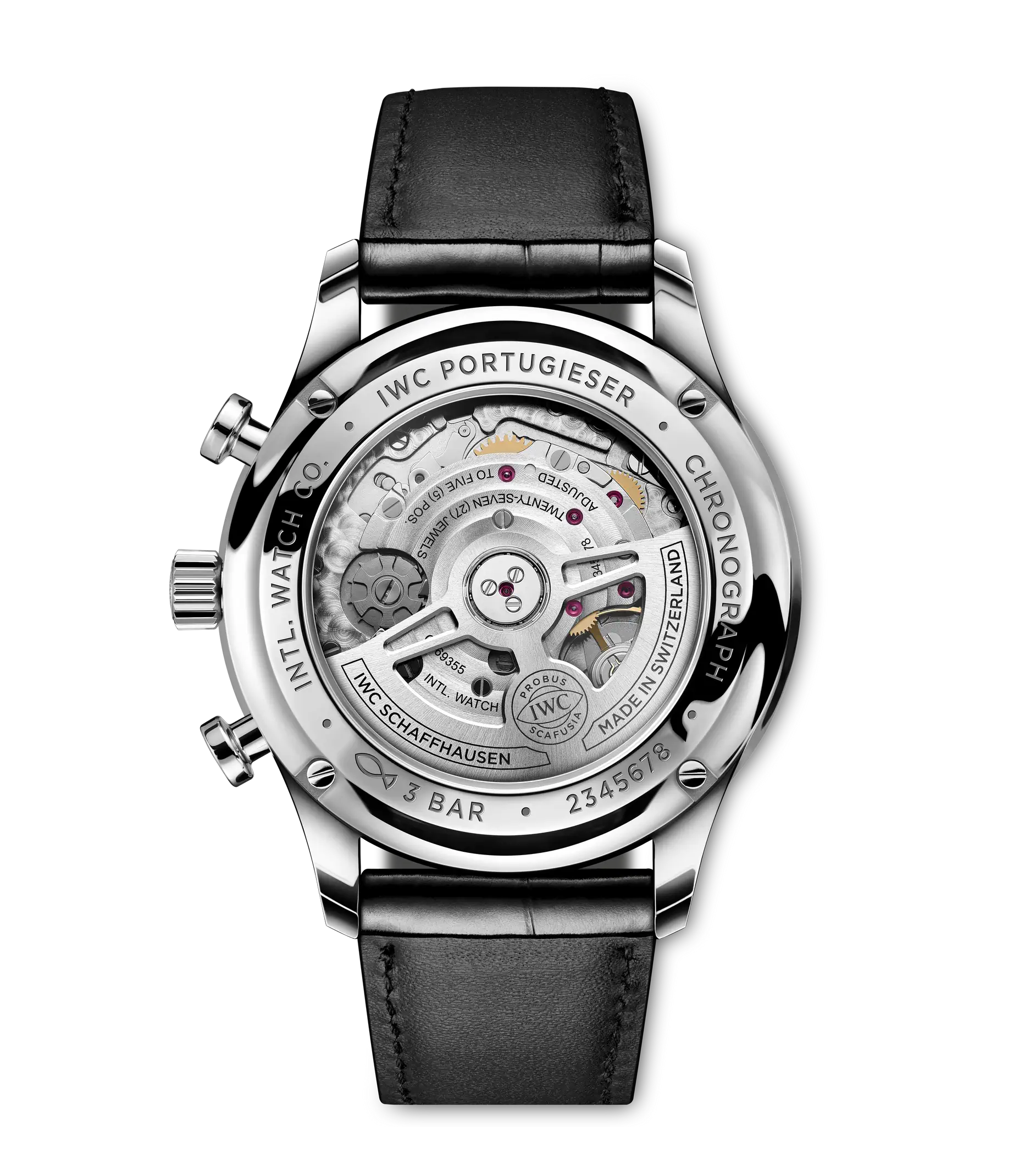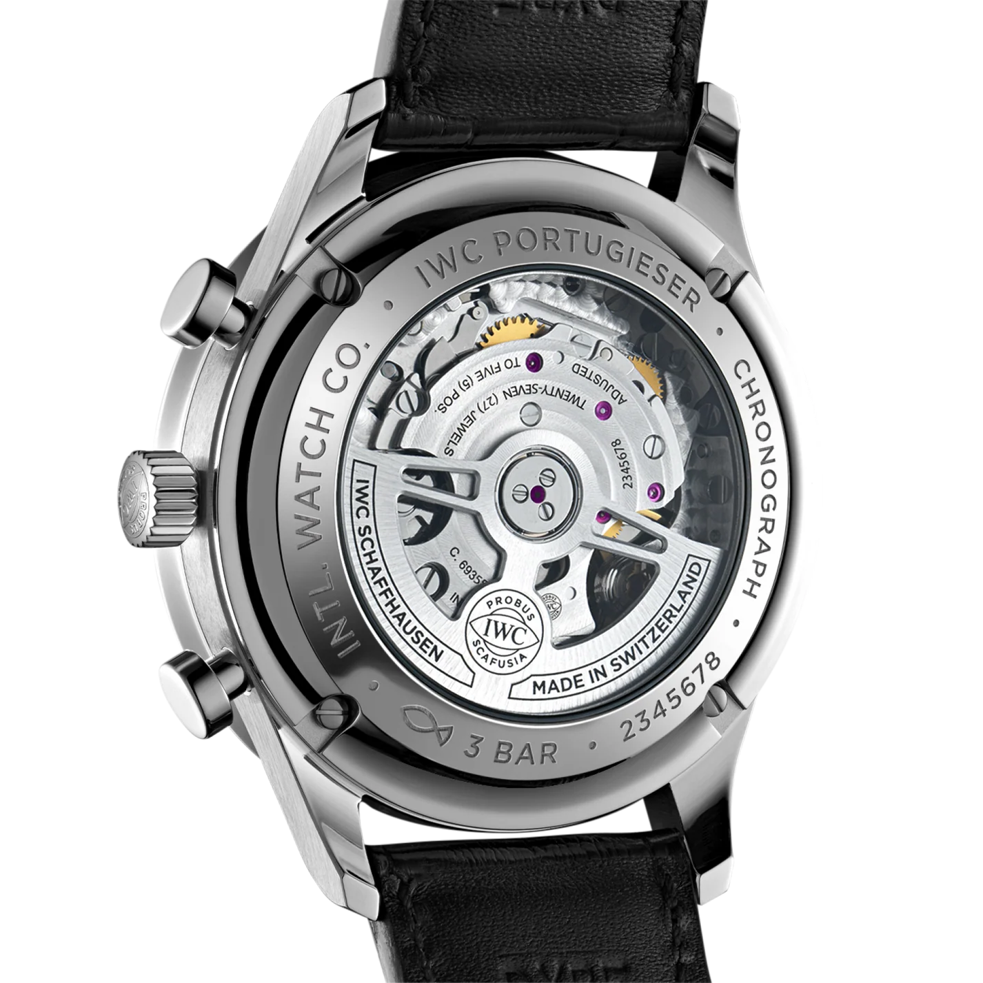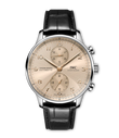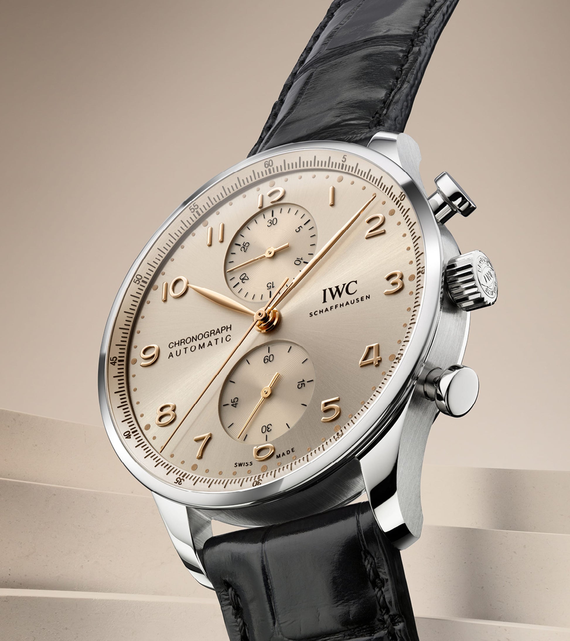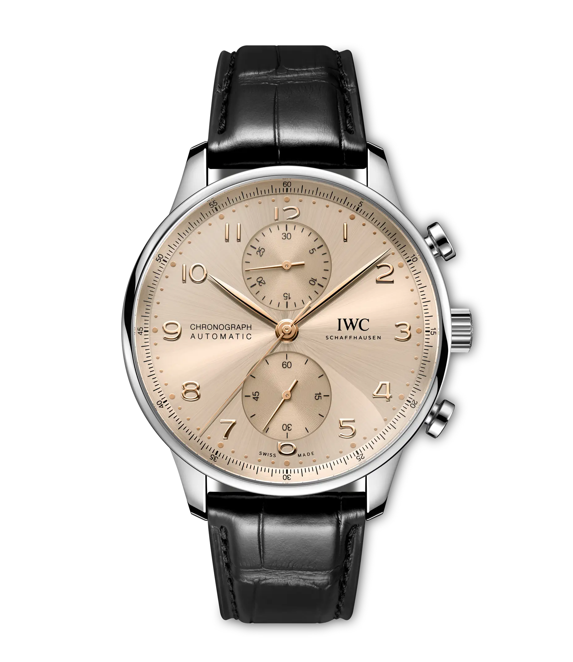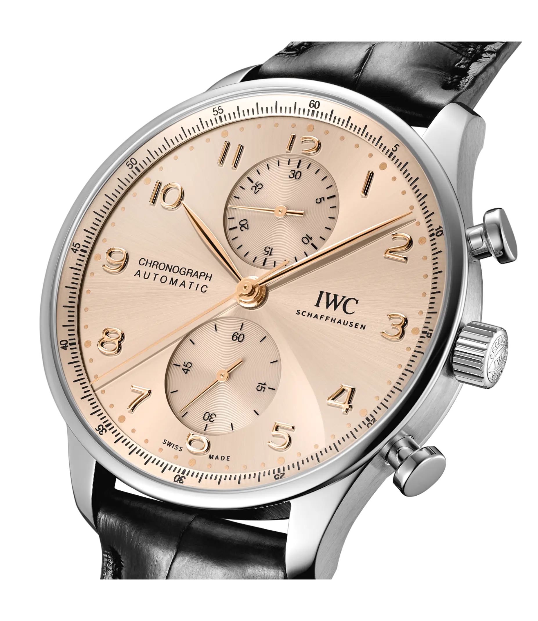 Der Portugieser Chronograph ist eines der ikonischsten Modelle von IWC Schaffhausen. Die harmonisch gestaltete Uhr mit umlaufender Präzisionsskala und vertieften Totalisatoren ist seit 1998 das begehrteste Mitglied der Portugieser-Familie. Mit seinem kompakten Durchmesser von 41mm passt der Chronograph an fast jedes Handgelenk. Durch die filigrane Lünette entsteht der Eindruck, als würde man eine bedeutend größere Uhr tragen. Das klare, funktionale Zifferblatt besticht mit applizierten arabischen Zahlen und schlanken Feuille-Zeigern. Der charakteristische, mit einer Viertelsekundenskala bedruckte Rehaut ermöglicht nicht nur ein präzises Ablesen der Stoppzeit, sondern erinnert auch an den Ursprung der Portugieser als nautisches Präzisionsinstrument für das Handgelenk. Diese Version verfügt über ein Edelstahl-Gehäuse, ein Zifferblatt in der Farbe "Dune" sowie vergoldete Zeiger und Gold-Appliken. Das Highlight der Uhr ist das aufwändig gefertigte Zifferblatt, das in einem komplexen Herstellungsprozess mit 60 einzelnen Schritten gefertigt wird. Die ungewöhnliche optische Tiefe entsteht durch das Auftragen von 15 Schichten transparenten Lacks, der fein geschliffen und anschließend auf Hochglanz poliert wird. Die Hilfszifferblätter werden sowohl in den Messingrohling als auch in die Lackschicht gefräst. Ein spezielles Druckverfahren verstärkt den dreidimensionalen Effekt. Zum Schluss werden die Appliken einzeln von Hand aufgesetzt. Die Uhr wird an einem schwarzen aus Krokolederband getragen. Im Inneren des sportlich-eleganten Chronographen arbeitet das IWC-Manufakturkaliber 69355. Das robuste und präzise Chronographenwerk in klassischer Kolonnenradbauweise lässt sich durch einen Sichtboden aus Saphirglas betrachten.