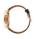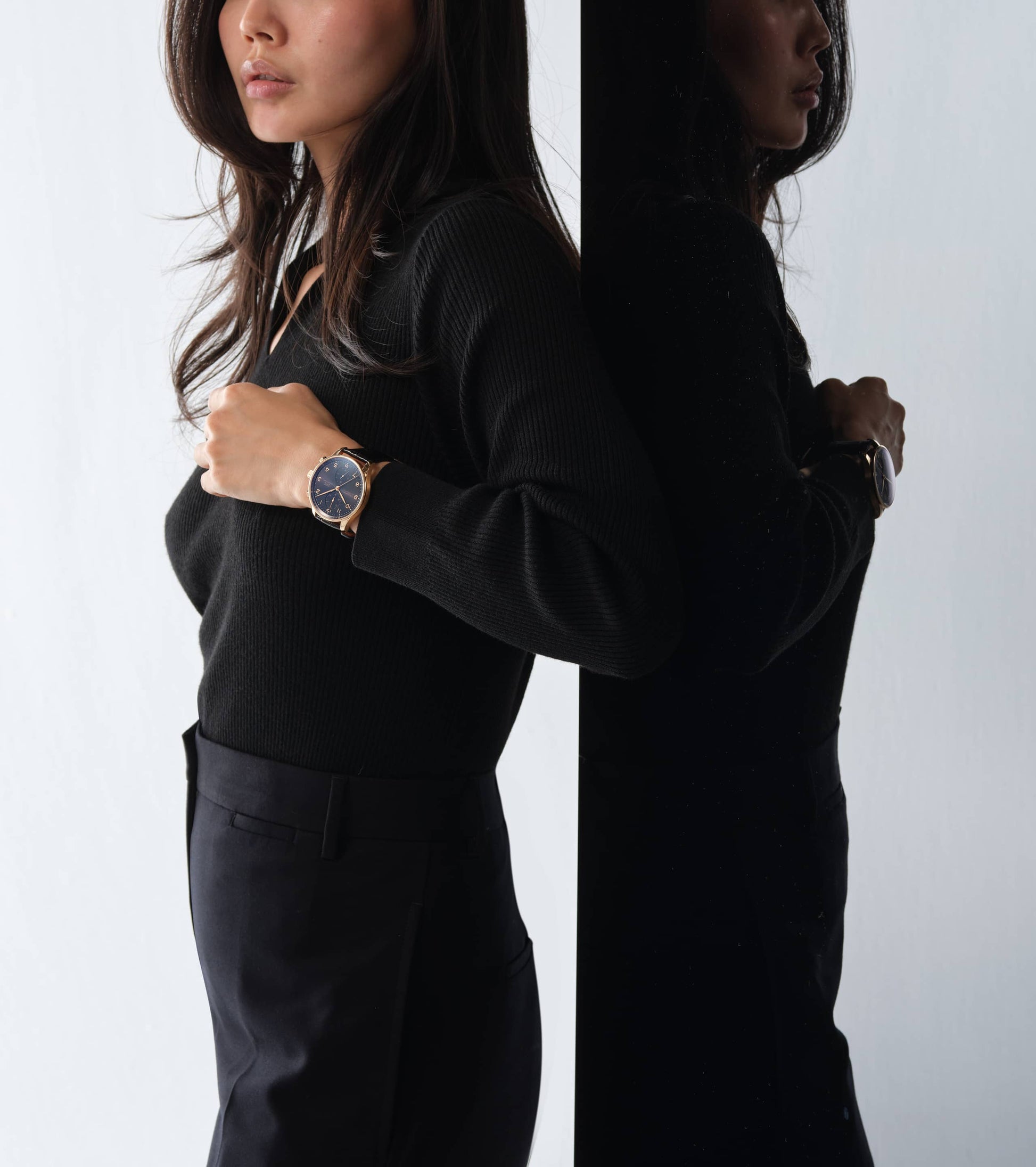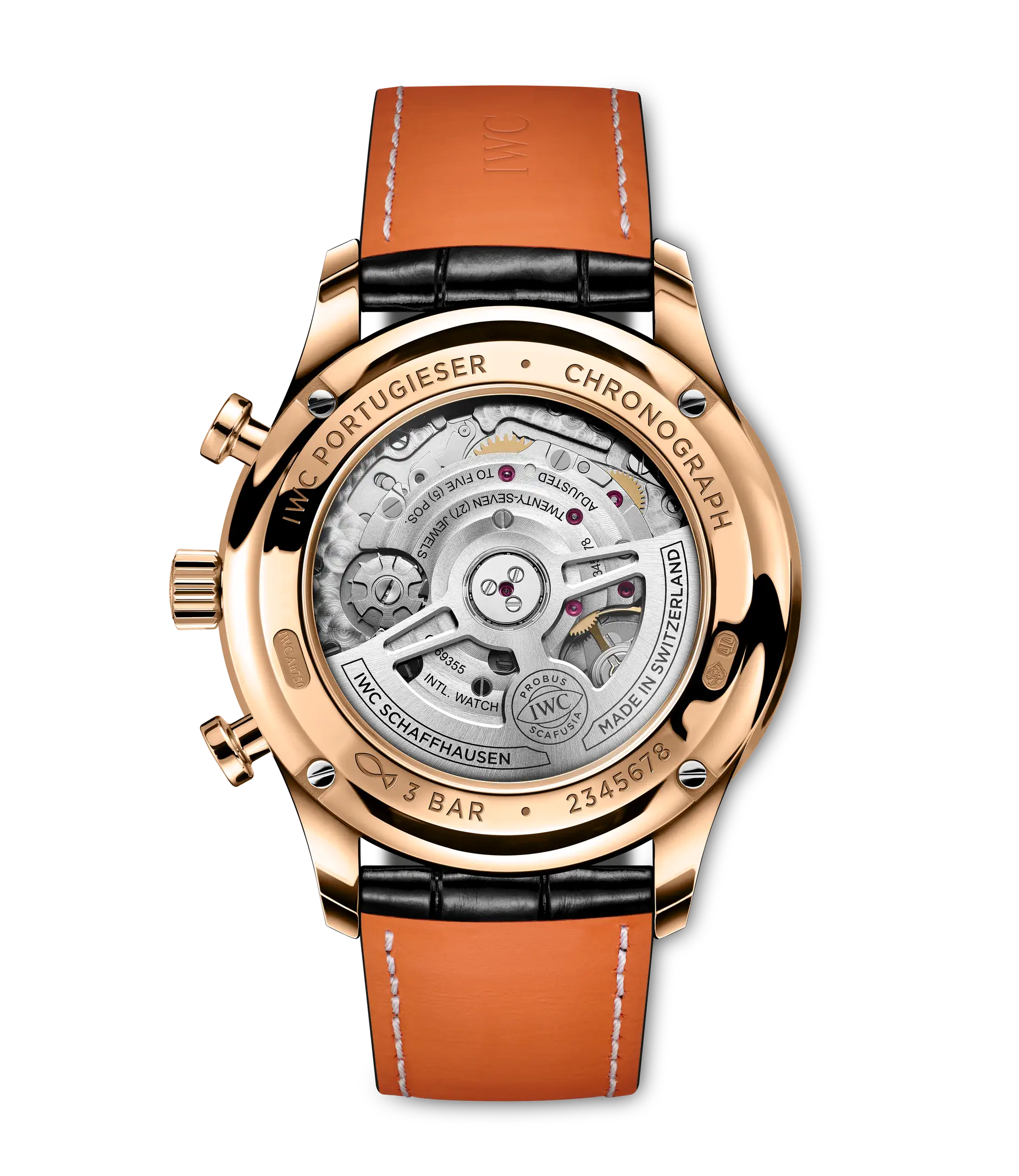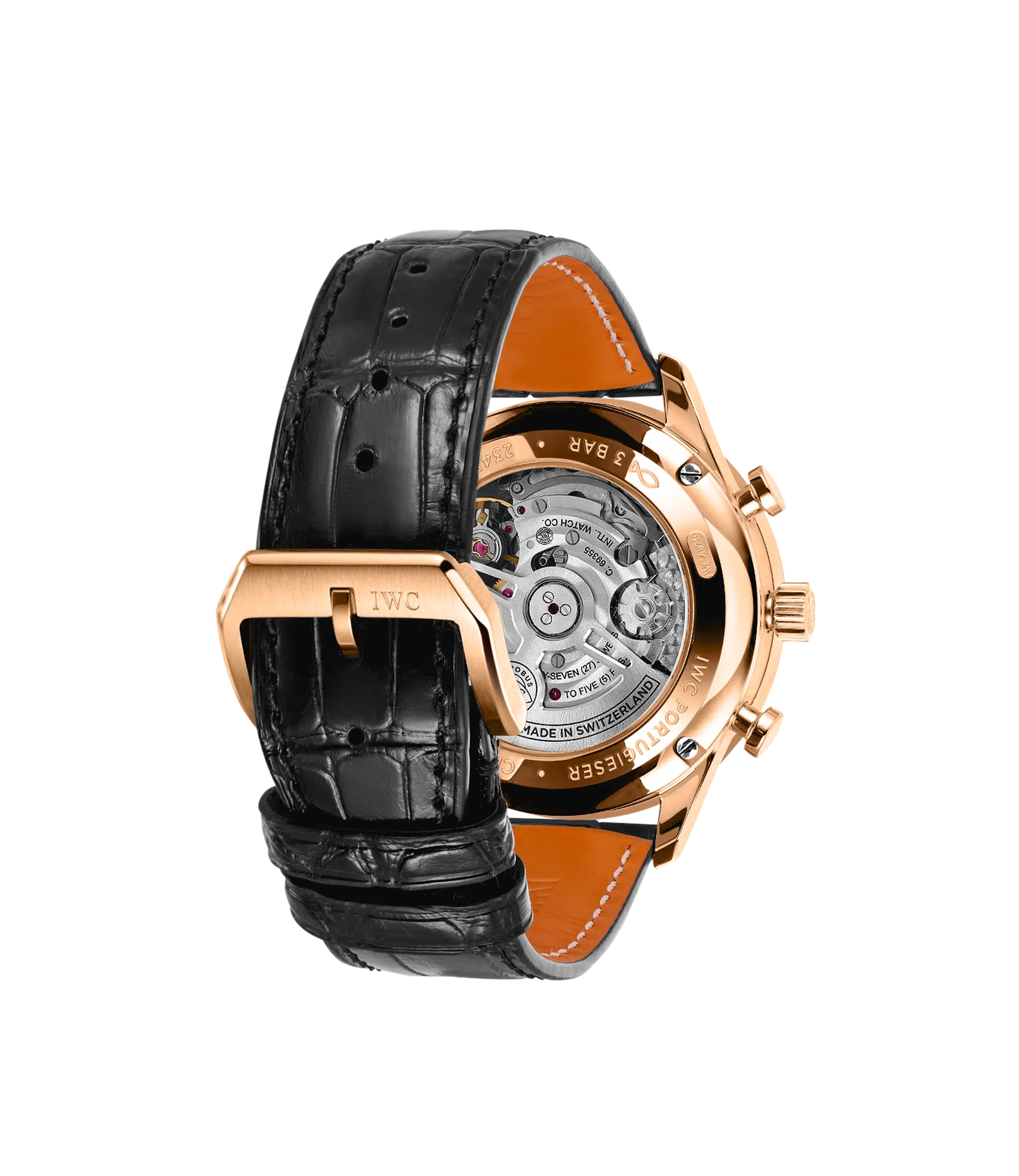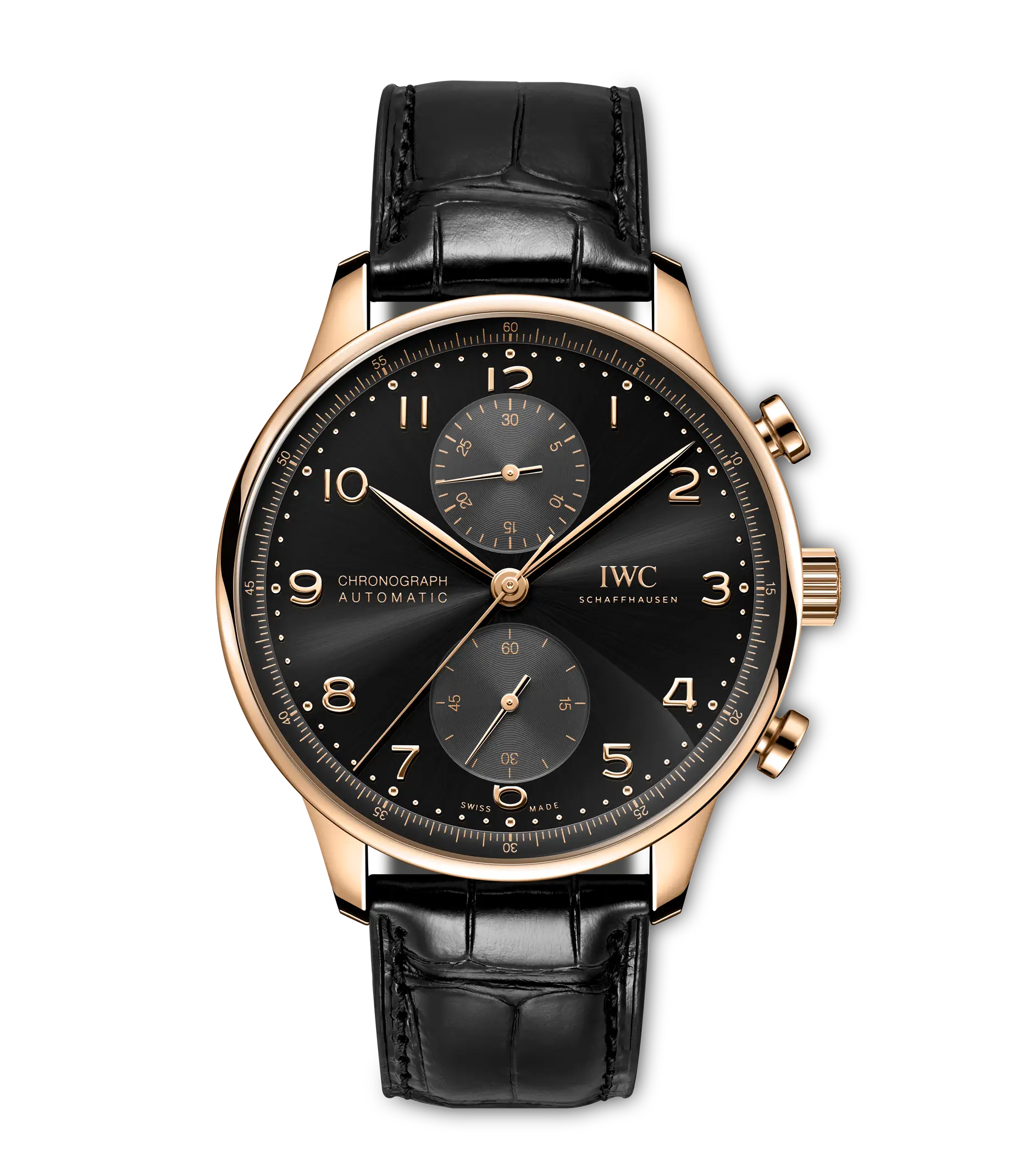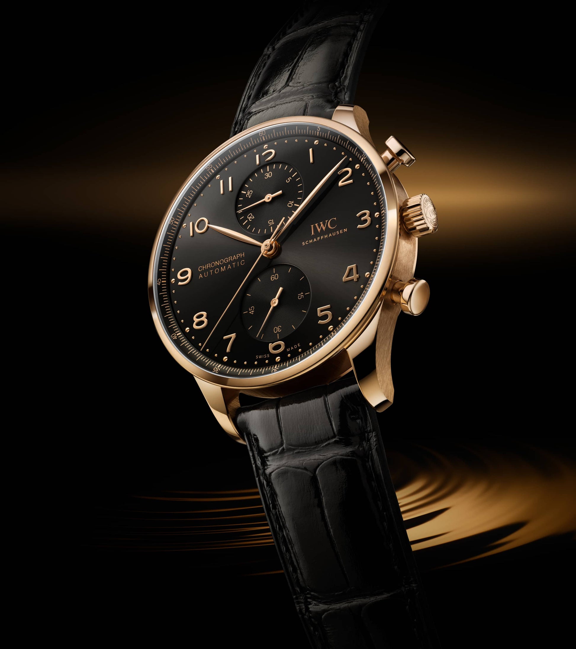 Seit 1998 bringt die Portugieser Chronograph eine sportlich-elegante Note in die Portugieser-Kollektion von IWC Schaffhausen. Die IWC-typische, vertikale Anordnung der Hilfszifferblätter zeigt die gestoppten Minuten direkt bei 12 Uhr an und platziert die kleine Sekunde bei 6 Uhr. Diese Anordnung verbessert die Ablesbarkeit und hat die Portugieser Chronograph zu einer Design-Ikone gemacht. Ein weiteres Merkmal ist der mit einer Viertelsekundenskala bedruckte Réhaut, der eine präzise Ablesung der Stoppzeit gewährleitet. Diese Version verfügt über ein poliertes Gehäuse aus 18 Karat Rotgold mit einem Durchmesser von 41mm, ein Zifferblatt in der Farbe "Obsidian" sowie vergoldete Zeiger und Gold-Appliken. Das Highlight der Uhr ist das aufwändig gefertigte Zifferblatt, das in einem komplexen Herstellungsprozess mit 60 einzelnen Schritten gefertigt wird. Die ungewöhnliche optische Tiefe entsteht durch das Auftragen von 15 Schichten transparenten Lacks, der fein geschliffen und anschließend auf Hochglanz poliert wird. Die Hilfszifferblätter werden sowohl in den Messingrohling als auch in die Lackschicht gefräst. Ein spezielles Druckverfahren verstärkt den dreidimensionalen Effekt. Zum Schluss werden die Appliken einzeln von Hand aufgesetzt. Angetrieben wird die Portugieser Chronograph durch das IWC-Manufakturkaliber 69355, ein mechanisches Chronographenwerk, das mit einem kompromisslosen Fokus auf Robustheit, Zuverlässigkeit und Langlebigkeit entwickelt wurde. Das schwarze Armband besteht aus Krokoleder, wird vom italienischen Hersteller Santoni bezogen und ist mit einer Dornschließe aus Rotgold ausgestattet.