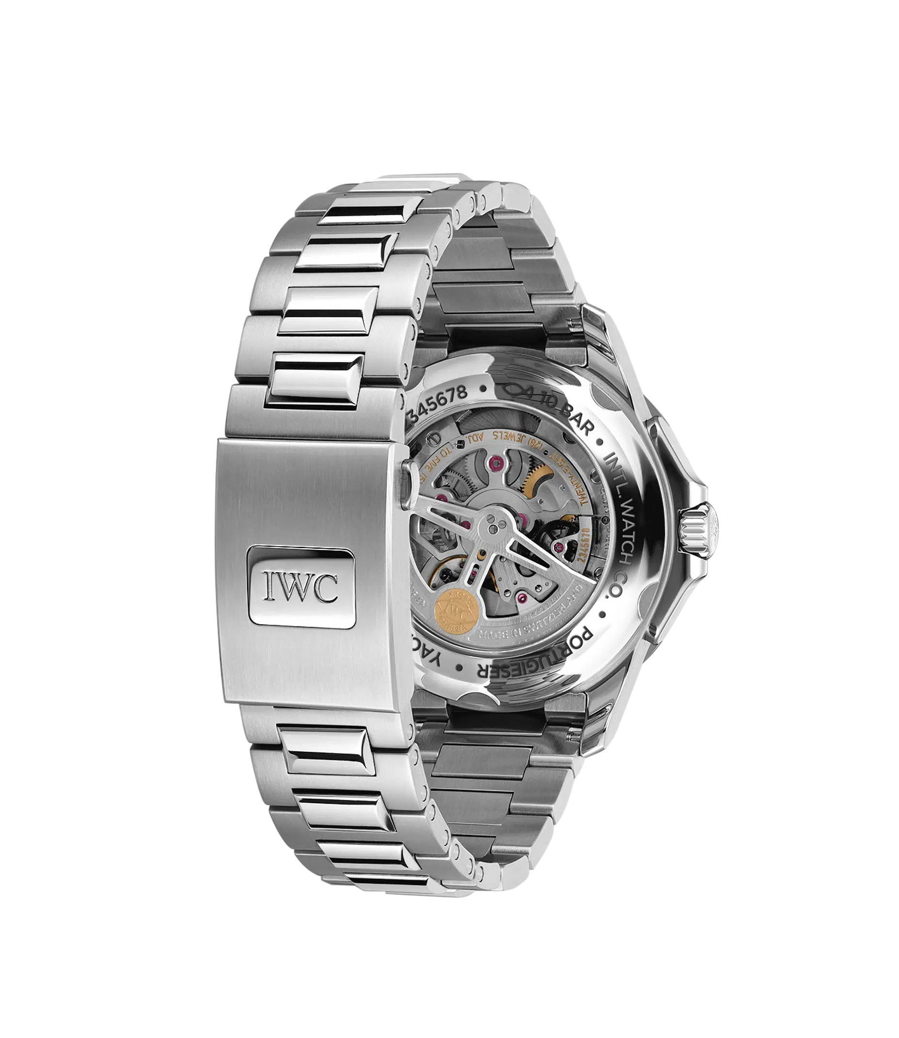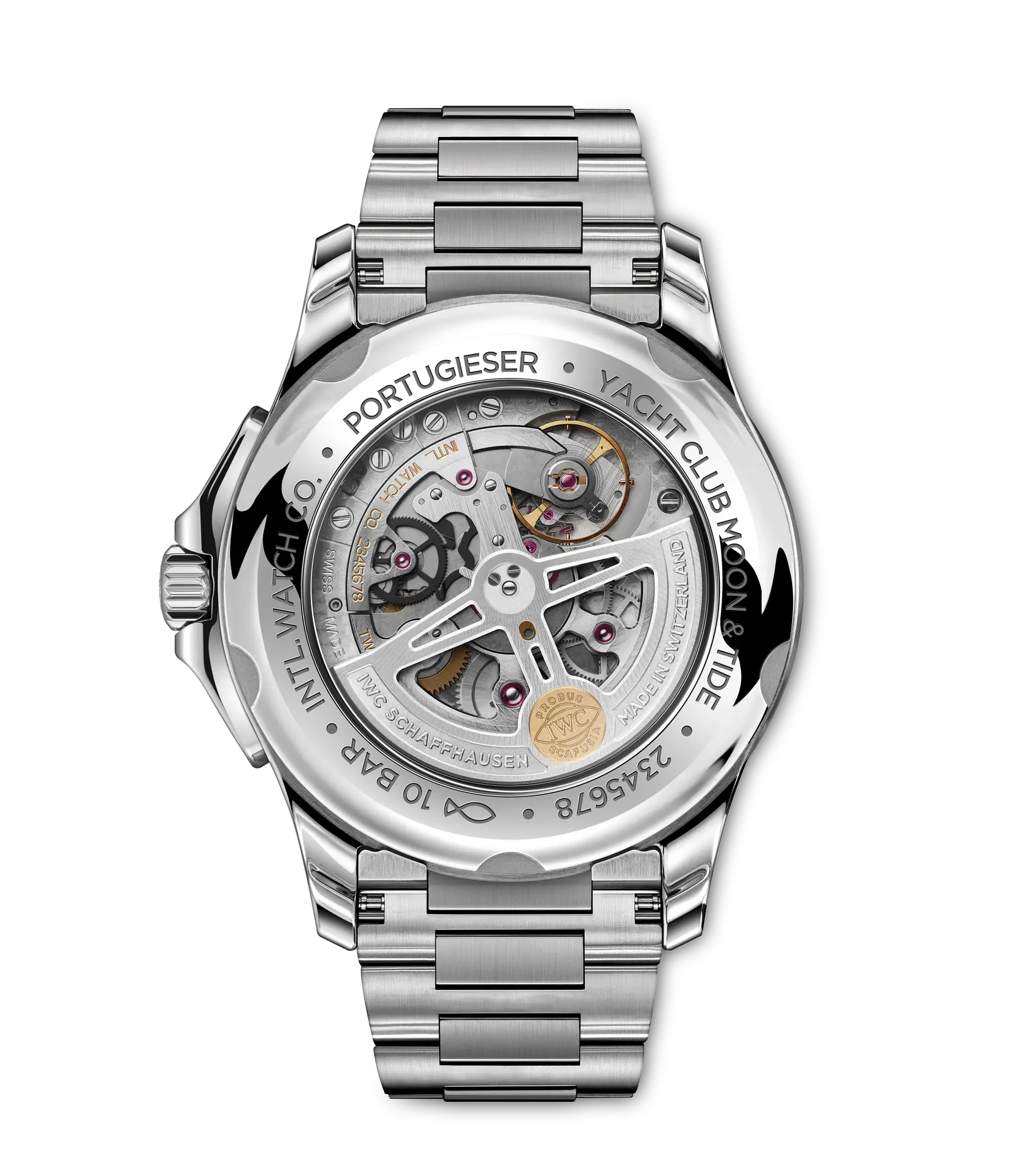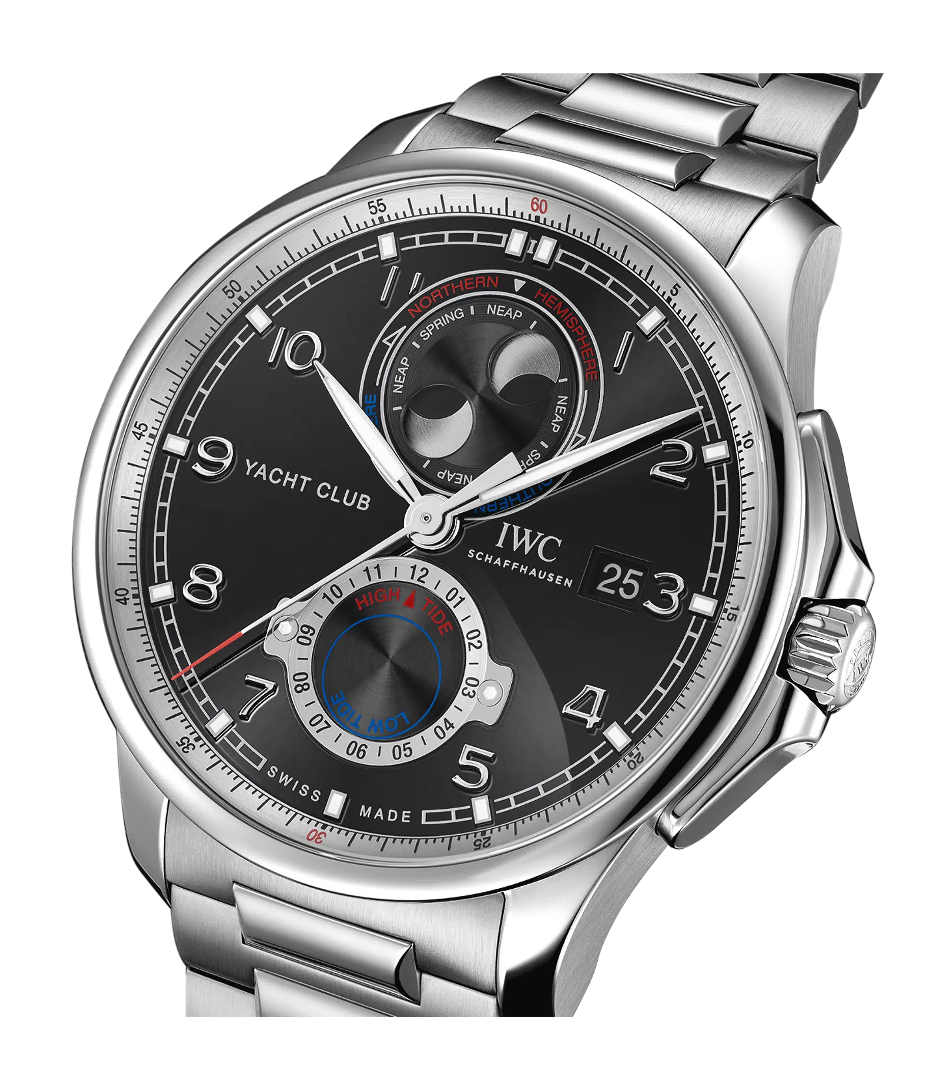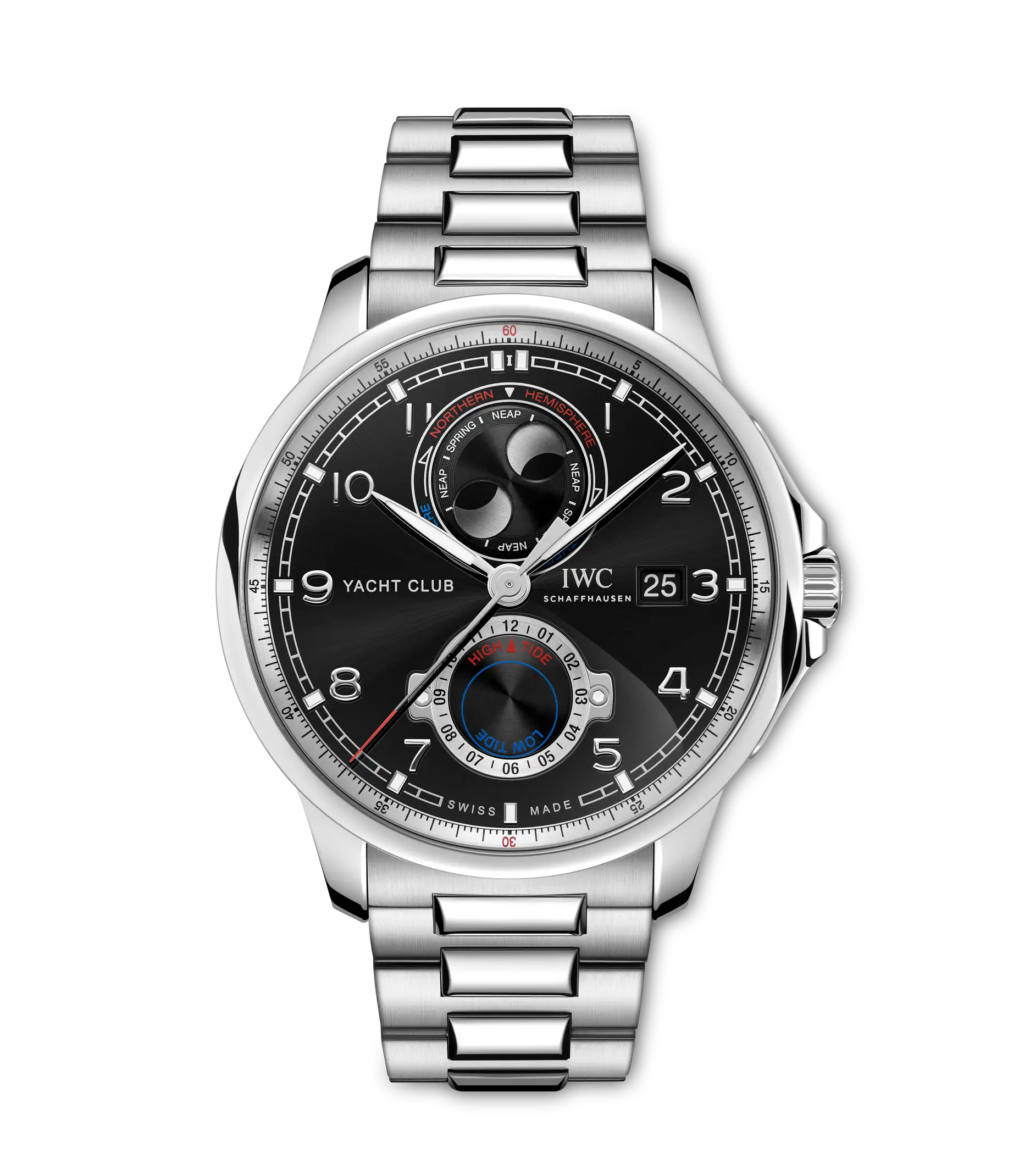 Die Portugieser Yacht Club Moon & Tide verfügt über ein Edelstahlgehäuse, ein schwarzes Zifferblatt, rhodinierte Zeiger und Appliken sowie ein Armband aus Edelstahl. Die erste Portugieser aus dem Jahr 1939 wurde von den Deck-Beobachtungsuhren von IWC Schaffhausen inspiriert, die damals als nautische Instrumente für die Navigation auf Schiffen eingesetzt wurden. Dieses Erbe spiegelt sich in der Portugieser Yacht Club wider, die seit 2010 eine Note von Sportlichkeit in die Kollektion bringt. Die Portugieser Yacht Club Moon & Tide ist das erste Edelstahlmodell, das mit der von IWC Schaffhausen entwickelten Gezeitenanzeige ausgestattet ist. Diese bei 6 Uhr auf dem Zifferblatt platzierte Anzeige informiert über den erwarteten Zeitpunkt für die nächste Ebbe und Flut. Ein weiteres Merkmal ist die Double-Moon™-Anzeige bei 12 Uhr, welche die Mondphase der nördlichen und südlichen Hemisphäre abbildet und erst nach 125 Jahren um einen Tag abweicht. Darüber hinaus wurde sie um Spring- und Nipptiden erweitert und informiert somit auch über die Stärke der aktuellen Gezeiten. Das schwarze Zifferblatt wird in einem aufwendigen Herstellungsprozess in 60 einzelnen Schritten gefertigt. Durch das Auftragen von 15 Schichten transparenten Lacks strahlt es eine enorme optische Tiefe aus. Die Uhr verfügt über ein poliertes Edelstahlgehäuse mit einem Durchmesser von 44,6mm sowie über rhodinierte Zeiger und Appliken. Der Sichtboden aus Saphirglas gewährt einen großzügigen Blick auf das IWC-Manufakturkaliber 82836 mit Pellaton-Automatikaufzug und Keramikkomponenten. Diese nautische Sportuhr ist mit einem Edelstahlarmband mit gebürsteten H-Gliedern und polierten Mittelgliedern ausgestattet.