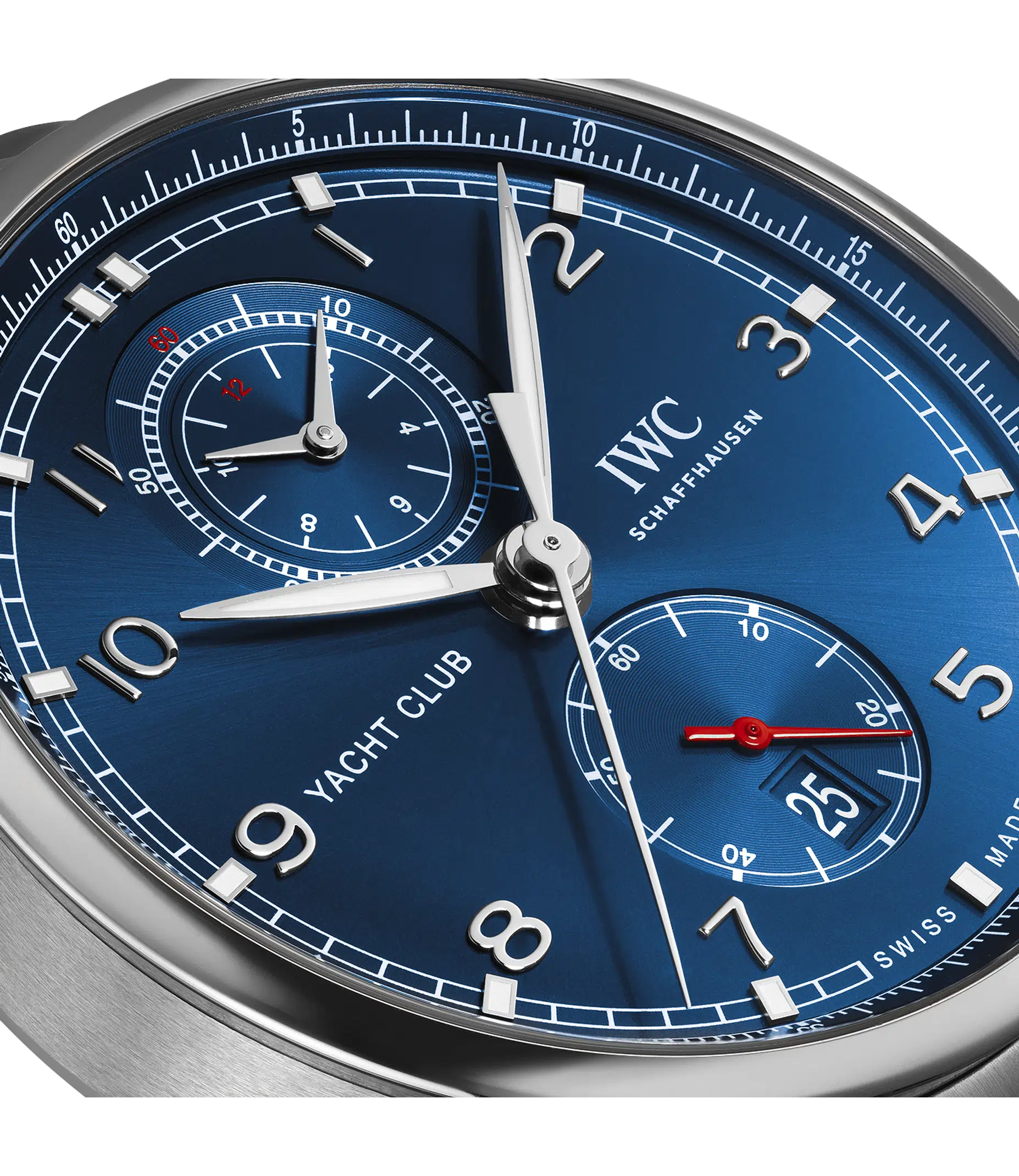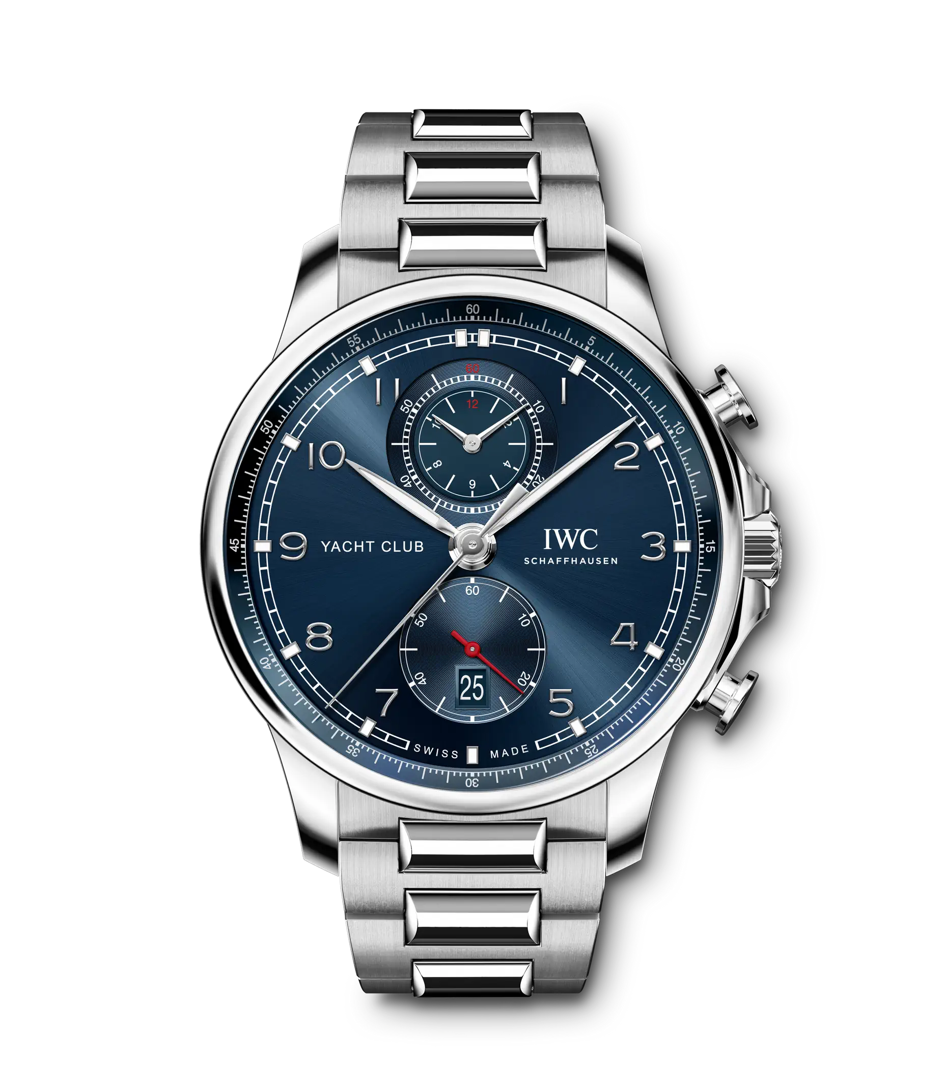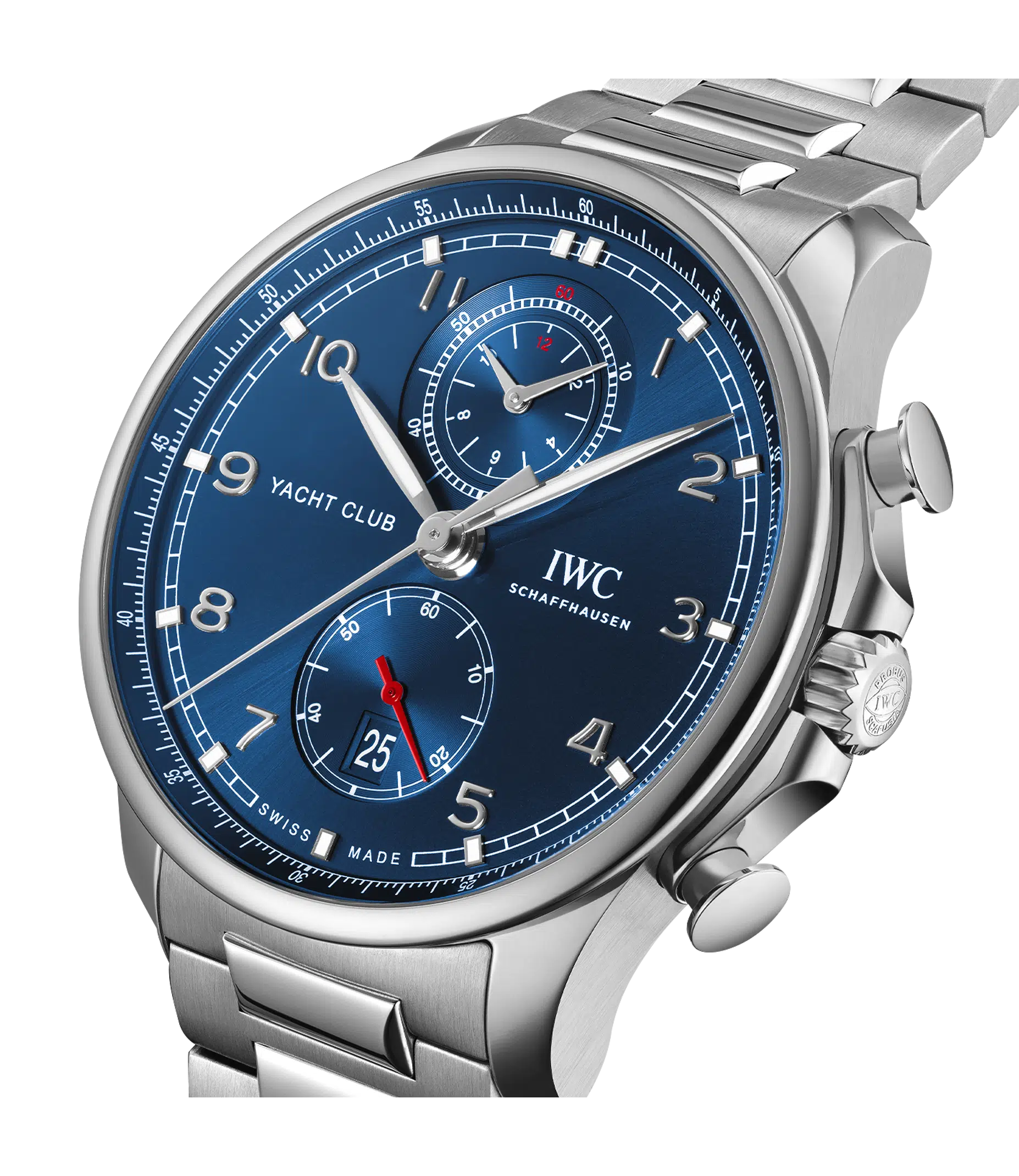 Dank ihrer robusten Bauweise und Wasserdichtigkeit ist die Portugieser Yacht Club Chronograph der perfekte Begleiter auf Deck und an Land. Als nautische Sportuhr verbindet die Portugieser Yacht Club Chronograph zeitlose Eleganz mit Robustheit und einer Wasserdichtigkeit von 100m. Diese Eigenschaften machen sie zu einem vielseitig einsetzbaren Zeitmesser, der sowohl auf dem Wasser als auch an Land eine hervorragende Figur macht. Die filigrane Lünette und der flache Gehäusering verleihen dem Edelstahlgehäuse mit einem Durchmesser von 44,6mm besonders elegante Proportionen. Das Zifferblatt dieses sportlichen Chronographen besticht mit den typischen Portugieser-Designmerkmalen wie der charakteristischen Minutenskala und den applizierten, arabischen Zahlen. Dieses Modell kombiniert ein dunkelblaues Zifferblatt mit silberfarbenen Zeigern und Appliken. Das IWC-Manufakturkaliber 89361 mit Flyback-Funktion stellt die gestoppten Stunden und Minuten kombiniert auf einem Compteur bei «12 Uhr» dar und bietet eine Gangreserve von 68 Stunden. Für einen perfekten Sitz am Handgelenk sorgt das hochwertige Edelstahlarmband mit polierten und satinieren Flächen.