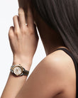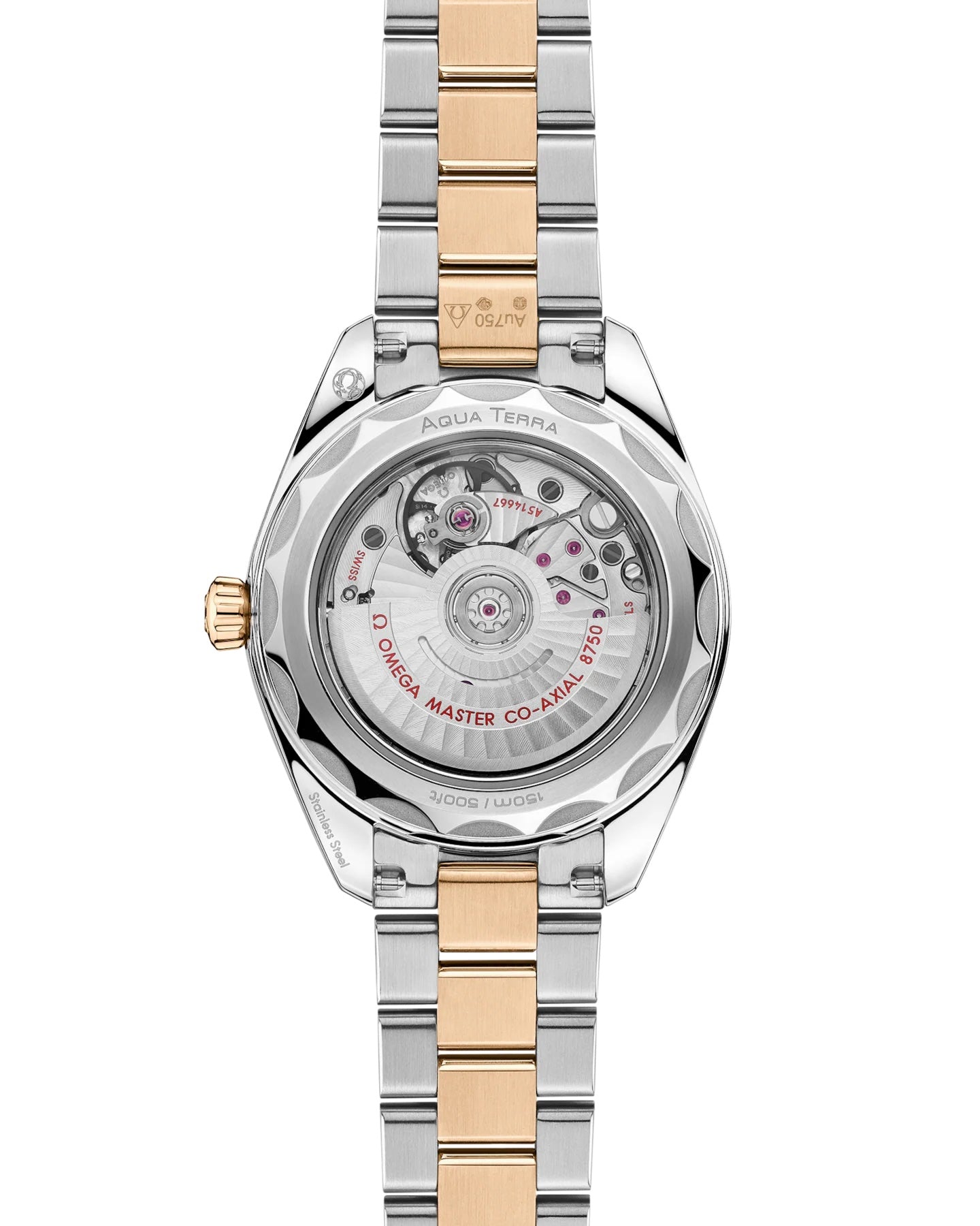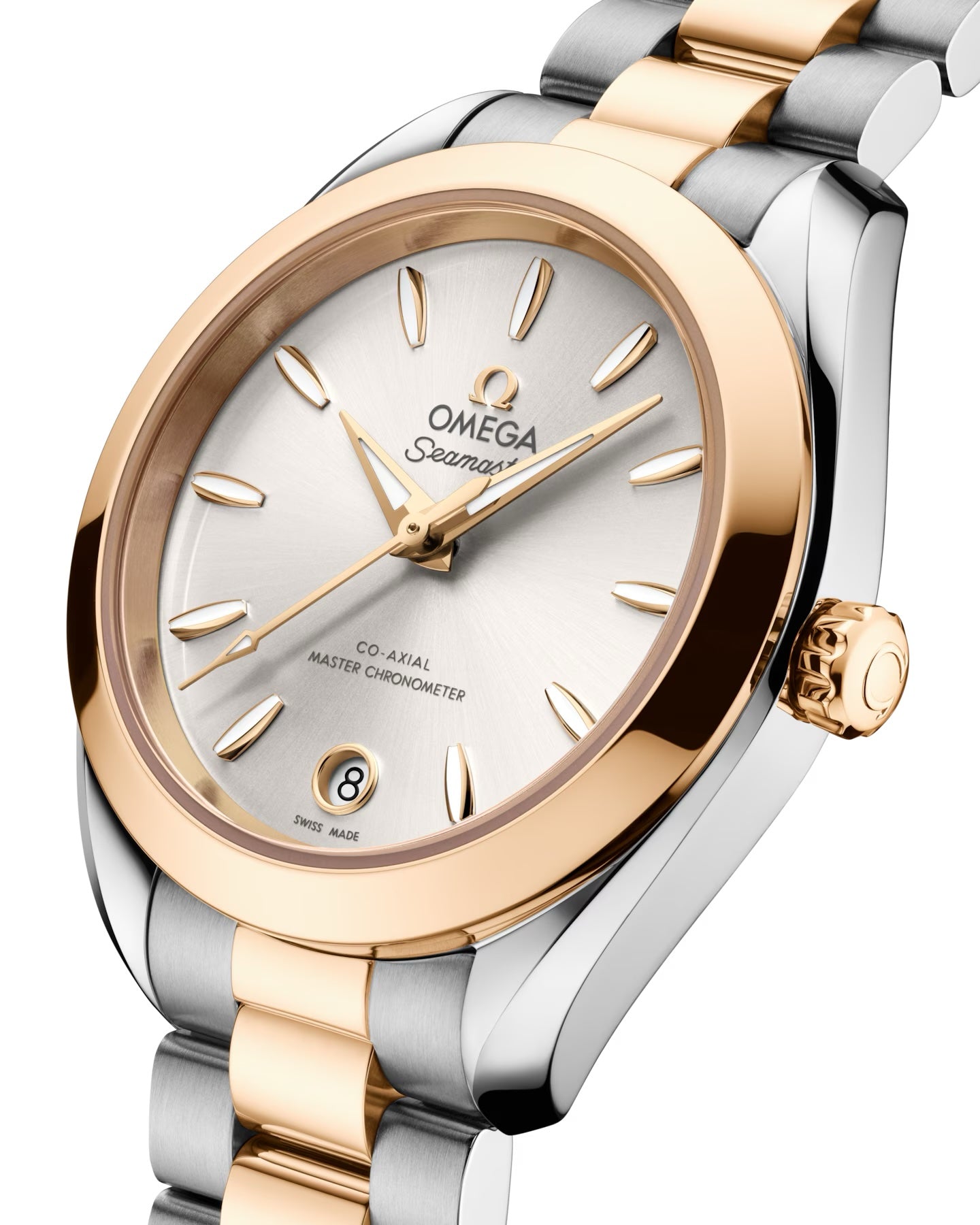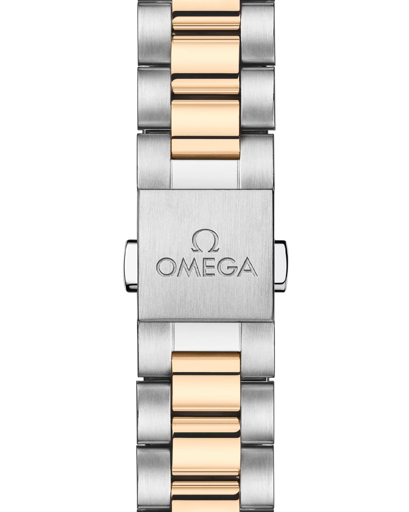 Die Seamaster Aqua Terra ist eine Hommage an Omegas großes maritimes Erbe. Die zarten Proportionen hat das schlanke 30mm-Gehäuse dieser Uhr dem innovativen Co-Axial-Master-Chronometer-Kaliber 8750 zu verdanken, das vom Eidgenössischen Institut für Metrologie (METAS) nach den höchsten Standards der Branche zertifiziert wurde. Das Modell besitzt ein symmetrisches, poliertes Gehäuse aus Edelstahl und 18kt Moonshine™-Gold und einen verschraubten Gehäuseboden mit Wellendekor. Das silberne Zifferblatt wurde mit einem Sonnenschliff und Lack versehen und weist ein kreisförmiges Datumsfenster bei 6 Uhr auf. Hervorgehoben wird es von elf bootsrumpfförmigen Indizes und überarbeiteten, facettierten Zeigern, wobei der Minutenzeiger in einer zarten Spitze endet. Alle applizierten Elemente wurden aus 18kt Moonshine™-Gold gefertigt, während die Zeiger aus 18kt Gelbgold mit PVD-Beschichtung aus Moonshine™-Gold bestehen. Indizes und Zeiger wurden außerdem mit weißer, im Dunkeln blau leuchtender Super-LumiNova gefüllt. Am Handgelenk gehalten wird die Uhr von einem integrierten Armband aus Edelstahl und 18kt Moonshine™-Gold mit schön abgerundeten, polierten und gebürsteten Gliedern, einer Doppelfaltschließe und dem einfachen Komfortverschluss von Omega.