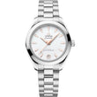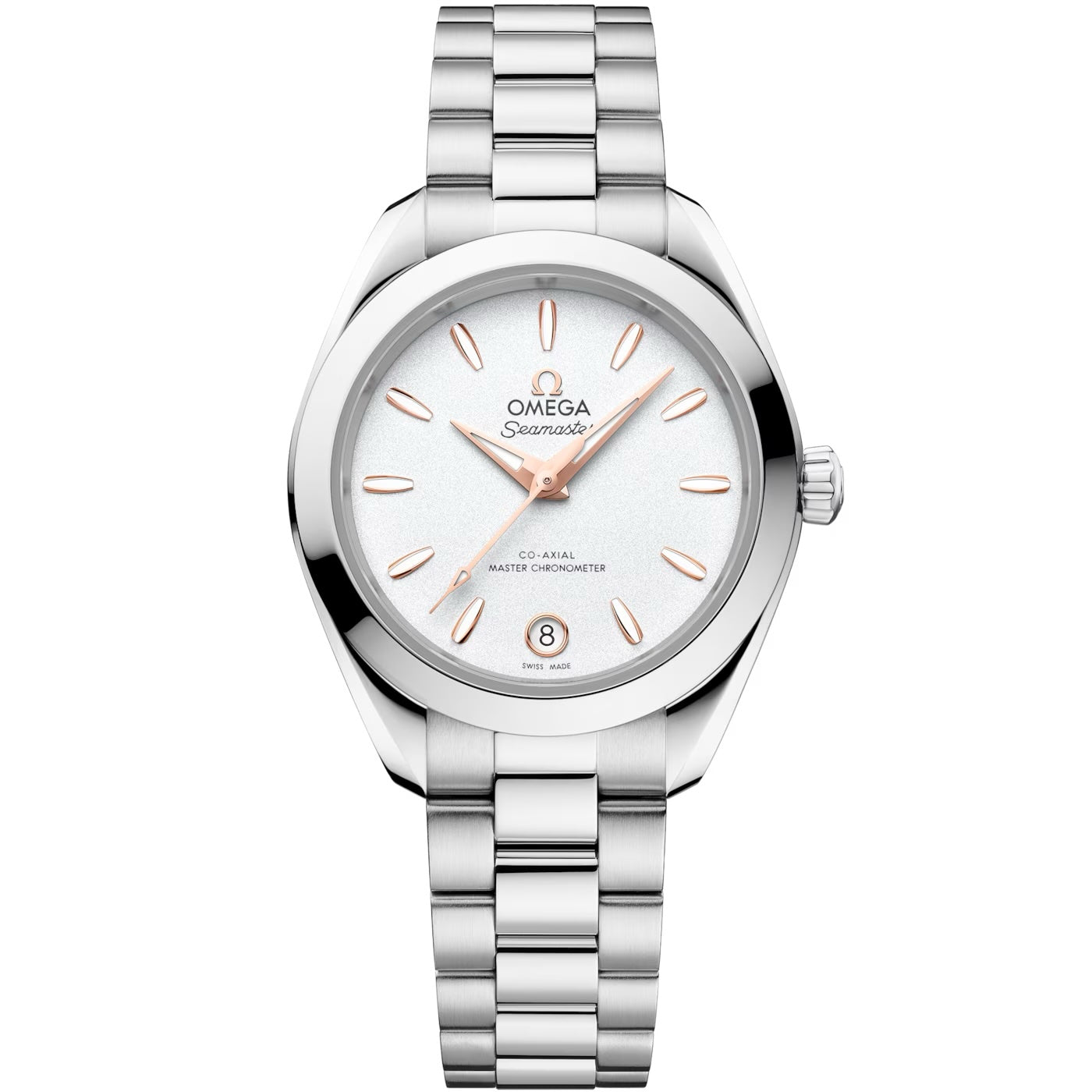 Die Seamaster Aqua Terra ist eine Hommage an Omegas großes maritimes Erbe. Die zarten Proportionen hat das schlanke 30mm-Gehäuse dieser Uhr dem innovativen Co-Axial-Master-Chronometer-Kaliber 8750 zu verdanken, das vom Eidgenössischen Institut für Metrologie (METAS) nach den höchsten Standards der Branche zertifiziert wurde. Das Modell besitzt ein symmetrisches, poliertes Gehäuse aus Edelstahl und einen verschraubten Gehäuseboden mit Wellendekor. Das silberne Zifferblatt weist ein Kristallfinish und ein kreisförmiges Datumsfenster bei 6 Uhr auf. Hervorgehoben wird es von elf bootsrumpfförmigen Indizes und überarbeiteten, facettierten Zeigern, wobei der Minutenzeiger in einer zarten Spitze endet. Alle applizierten Elemente sowie die Zeiger wurden aus 18kt Sedna™-Gold gefertigt. Die Indizes und Zeiger wurden außerdem mit weißer, im Dunkeln blau leuchtender Super-LumiNova gefüllt. Am Handgelenk gehalten wird die Uhr von einem Edelstahlarmband mit schön abgerundeten, polierten und gebürsteten Gliedern, einer Doppelfaltschließe und dem einfachen Komfortverschluss von Omega.