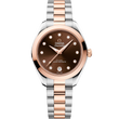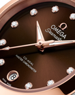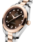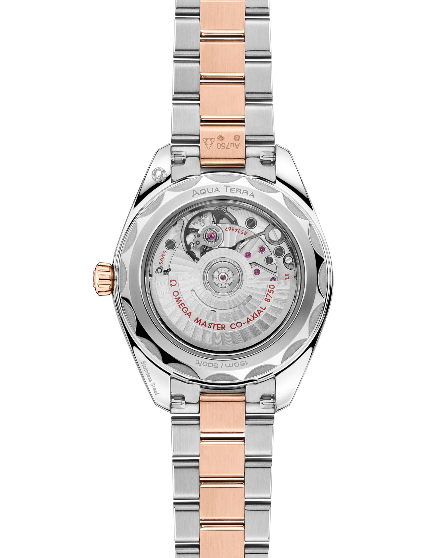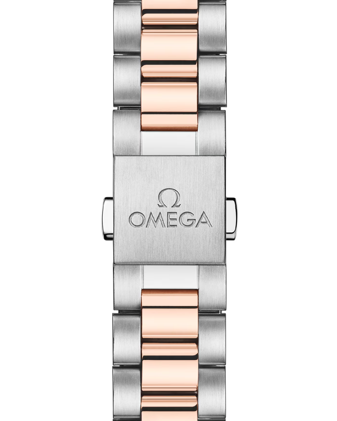 Die Seamaster Aqua Terra ist eine Hommage an OMEGAs großes maritimes Erbe. Seine zarten Proportionen hat das schlanke 30mm-Gehäuse dieser Uhr dem innovativen Co-Axial-Master-Chronometer-Kaliber 8750 zu verdanken, das vom Eidgenössischen Institut für Metrologie (METAS) nach den höchsten Standards der Branche zertifiziert wurde. Das Modell besitzt ein symmetrisches, poliertes Gehäuse aus Edelstahl und 18kt Sedna™-Gold und einen verschraubten Gehäuseboden mit Wellendekor. Das braune Zifferblatt wurde mit einem Sonnenschliff, einer PVD-Beschichtung und Lack versehen und weist ein kreisförmiges Datumsfenster bei 6 Uhr auf. Hervorgehoben wird es von elf Diamantstundenindizes und überarbeiteten, facettierten Zeigern, wobei der Minutenzeiger in einer zarten Spitze endet. Alle applizierten Elemente sowie die Zeiger wurden aus 18kt Sedna™-Gold gefertigt. Die Zeiger wurden außerdem mit weißer, im Dunkeln blau leuchtender Super-LumiNova gefüllt. Am Handgelenk gehalten wird die Uhr von einem integrierten Armband aus Edelstahl und 18kt Sedna™-Gold mit schön abgerundeten, polierten und gebürsteten Gliedern, einer Doppelfaltschließe und dem einfachen Komfortverschluss von Omega.