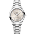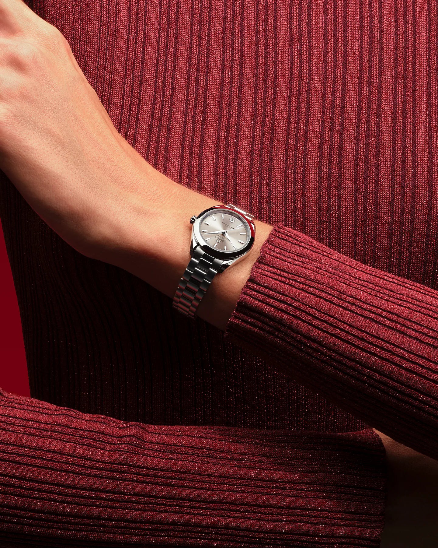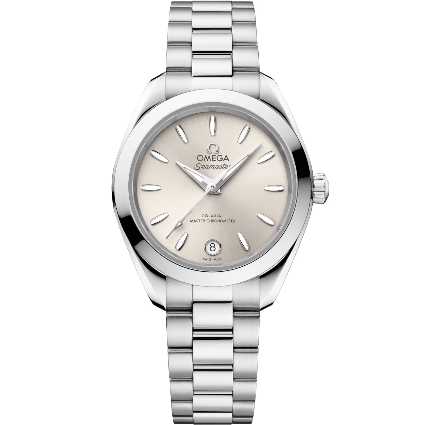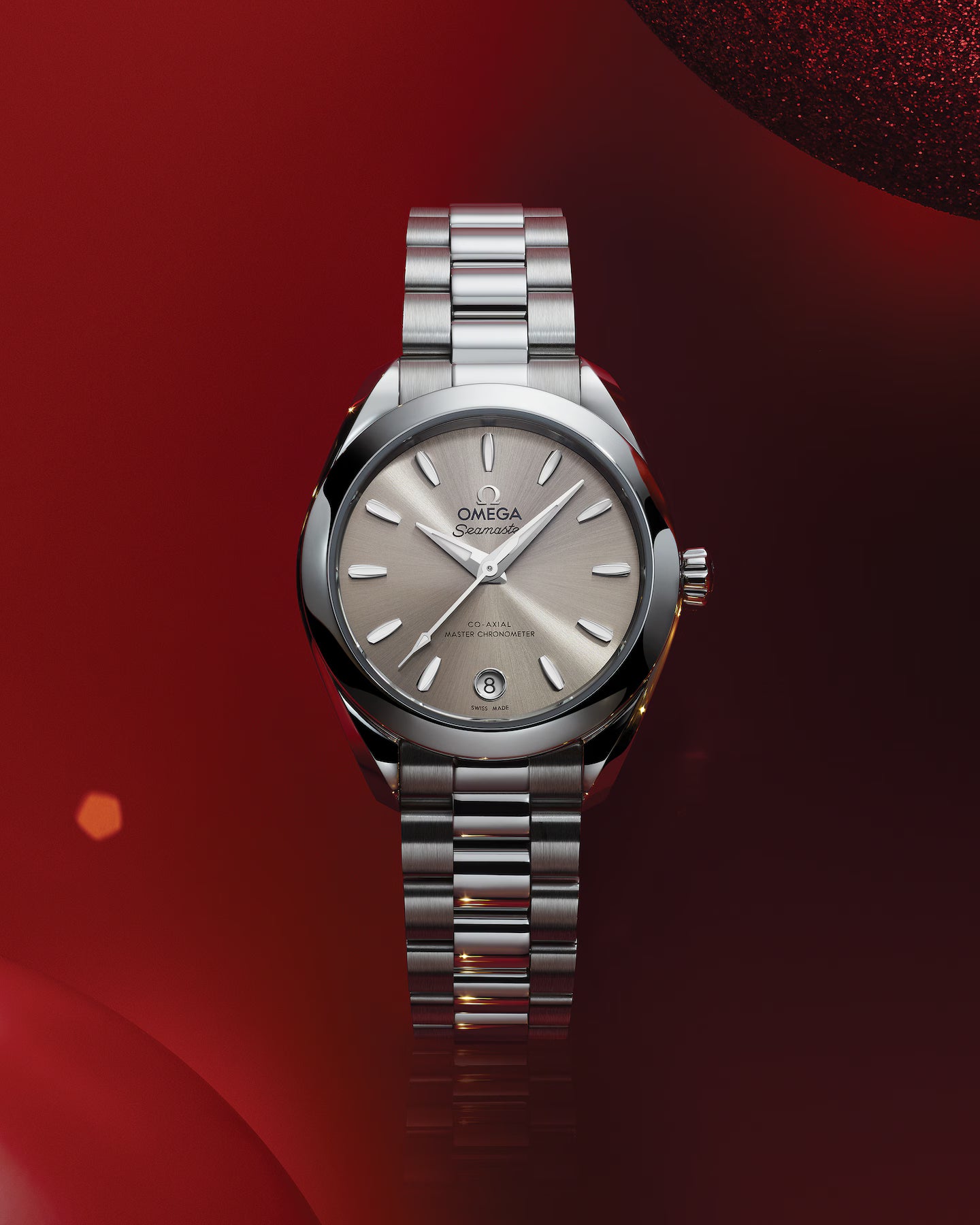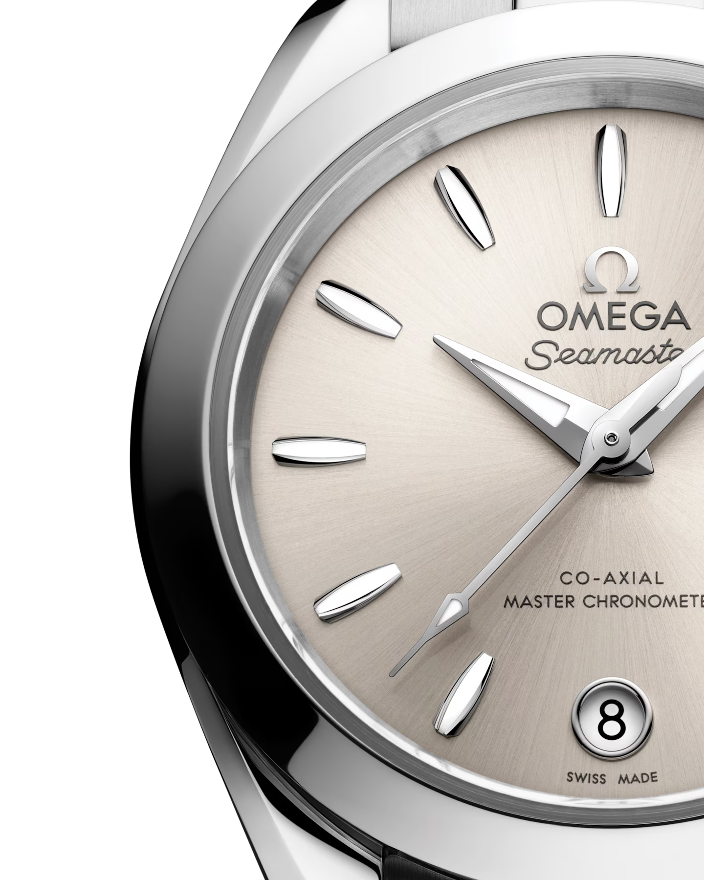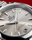 Die Seamaster Aqua Terra ist eine Hommage an Omegas großes maritimes Erbe. Die zarten Proportionen hat das schlanke 30mm-Gehäuse dieser Uhr dem innovativen Co-Axial-Master-Chronometer-Kaliber 8750 zu verdanken, das vom Eidgenössischen Institut für Metrologie (METAS) nach den höchsten Standards der Branche zertifiziert wurde. Das Modell besitzt ein symmetrisches, poliertes Gehäuse aus Edelstahl und einen verschraubten Gehäuseboden mit Wellendekor. Das sandsteinfarbene Zifferblatt wurde mit einem Sonnenschliff und farbigem Lack versehen und weist ein kreisförmiges Datumsfenster bei 6 Uhr auf. Hervorgehoben wird es von elf bootsrumpfförmigen Indizes und überarbeiteten, facettierten Zeigern, wobei der Minutenzeiger in einer zarten Spitze endet. Alle applizierten Elemente sowie die Zeiger wurden aus 18kt Sedna™-Gold gefertigt. Die Indizes und Zeiger wurden außerdem mit weißer, im Dunkeln blau leuchtender Super-LumiNova gefüllt. Am Handgelenk gehalten wird die Uhr von einem Edelstahlarmband mit schön abgerundeten, polierten und gebürsteten Gliedern, einer Doppelfaltschließe und dem einfachen Komfortverschluss von Omega.