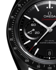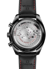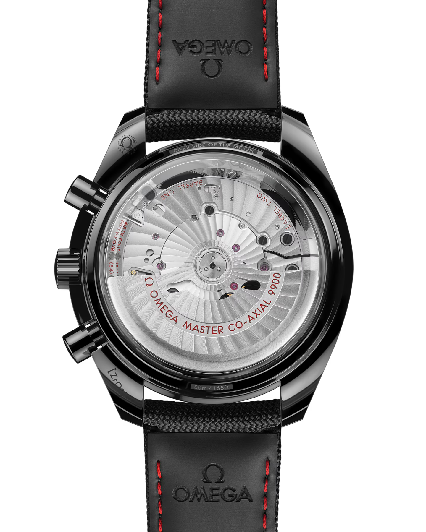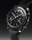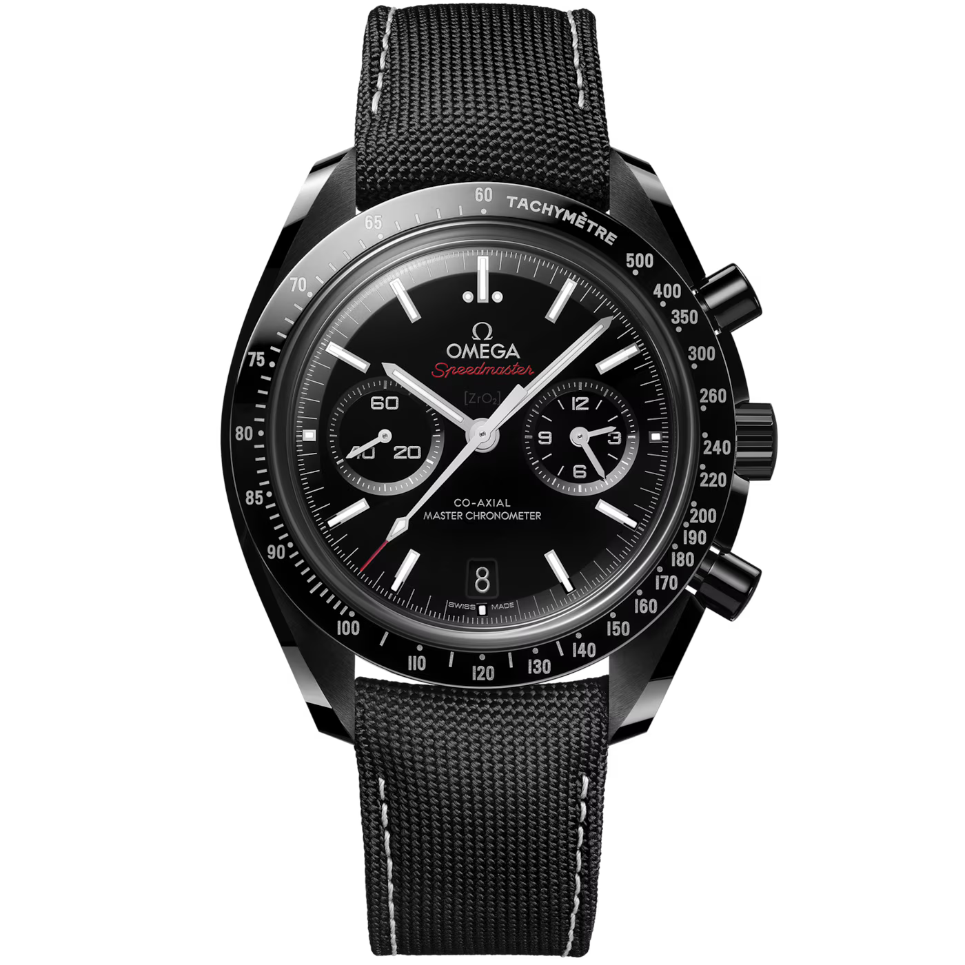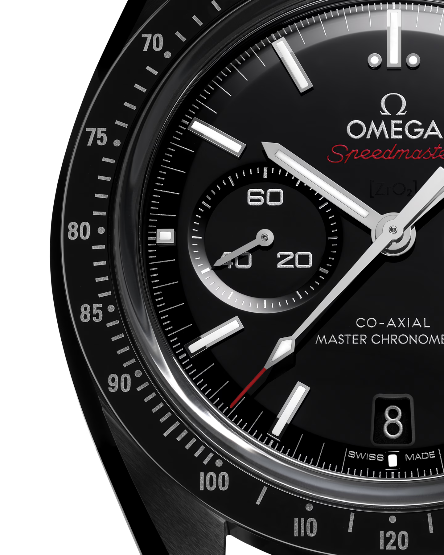 Als Hommage an Omegas Vermächtnis der Weltraumforschung verfügt diese Speedmaster Dark Side of the Moon über ein 44,25 mm großes Gehäuse aus polierter, schwarzer Keramik. Die polierte Lünette ist ebenfalls aus schwarzer Keramik gefertigt und verfügt über eine Tachymeterskala aus Liquidmetal™. Unter dem Saphirglas der Vorderseite bietet das polierte Keramikzifferblatt eine kleine Sekundenanzeige bei 9 Uhr, einen 60-Minuten- und 12-Stunden-Zähler bei 3 Uhr und ein Datumsfenster bei 6 Uhr. Die Stunden- und Minutenzeiger sowie die abgeschrägten Indizes und Hilfszifferblattzeiger sind alle aus 18kt Weißgold gefertigt und mit hellgrüner Super-LumiNova (grün leuchtend) gefüllt. Der zentrale Chronographenzeiger mit PVD-Weißgold-Beschichtung zeigt eine rote Spitze. Angetrieben vom Co-Axial-Master-Chronometer-Kaliber 9900 mit Automatikaufzug, ist dieser markante Zeitmesser mit einem schwarzen Nylonarmband mit Innenseite aus schwarzem Kautschuk, einer Faltschließe aus Keramik und Federklappen aus keramisiertem Titan ausgestattet.
