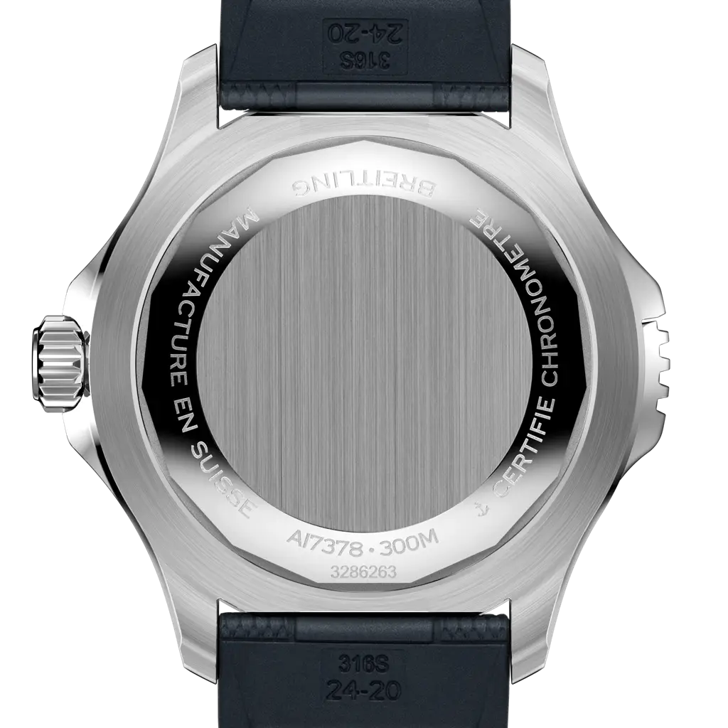 Edelstahl mit dunkelblauer Keramik-Lünette, dunkelblaues Kautschukband mit Faltschließe, Automatikwerk Kaliber Breitling 17, Gangreserve ca. 38 Stunden, Saphirglas, Durchmesser 46mm, wasserdicht bis 300m, zwei Jahre Garantie