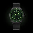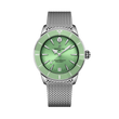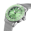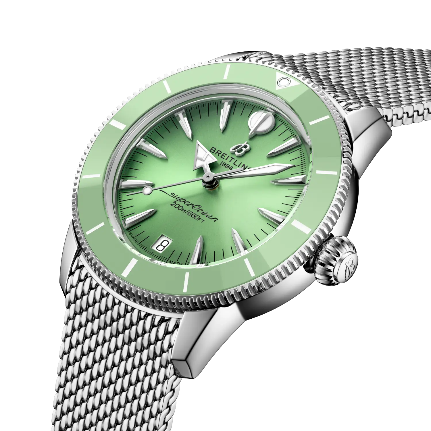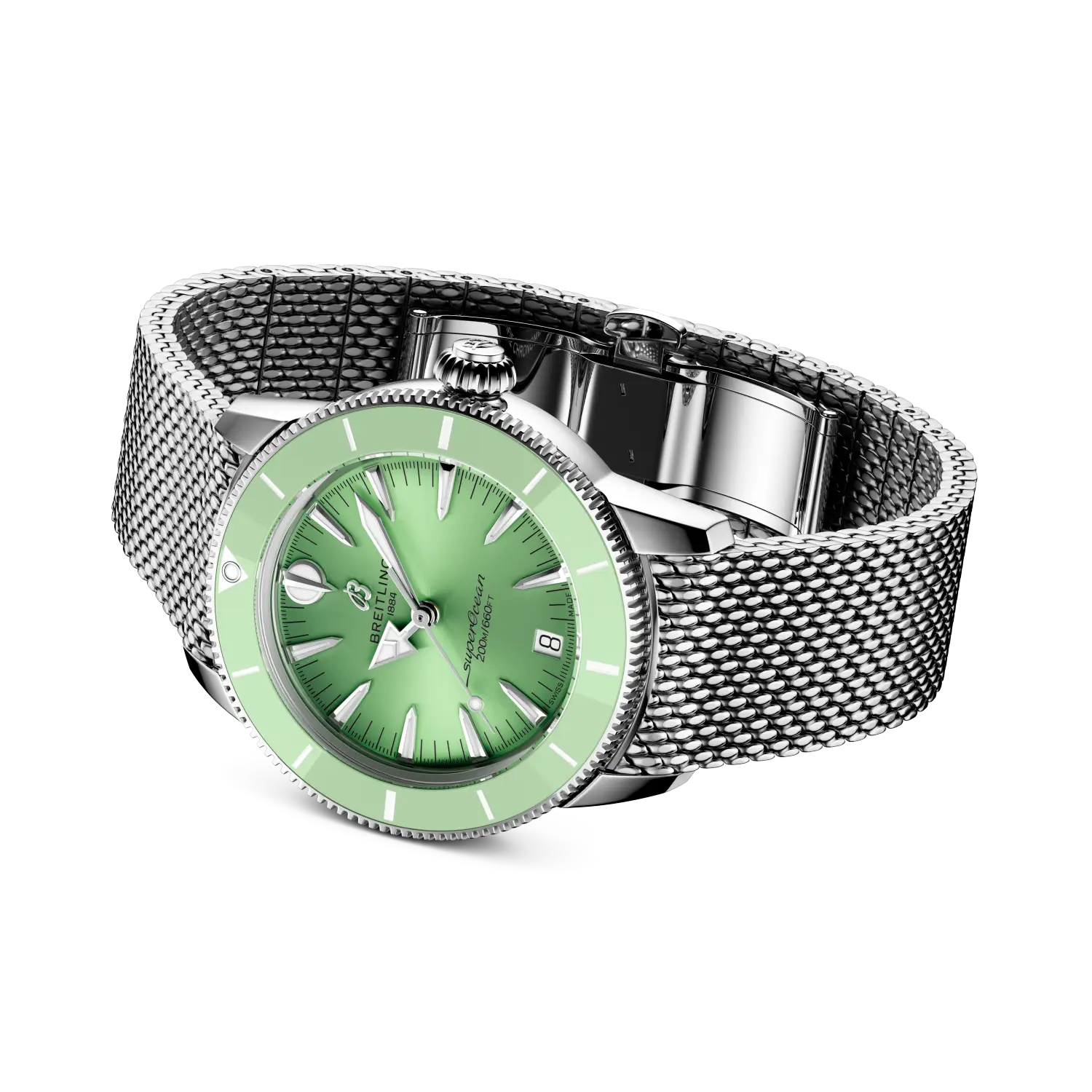Edelstahl mit mintgrüner Keramik-Lünette, Edelstahlband mit Doppel-Faltschließe, Automatikwerk Kaliber Breitling 10, Gangreserve ca. 42 Stunden, Datumsanzeige, Saphirglas, Durchmesser 36mm, wasserdicht bis 200m, zwei Jahre Garantie