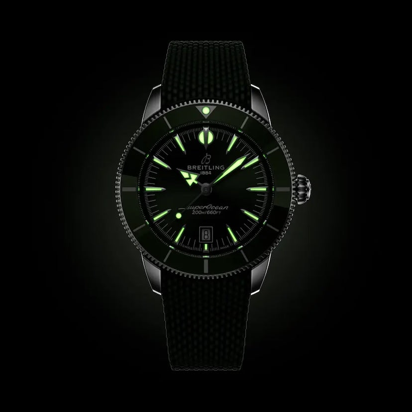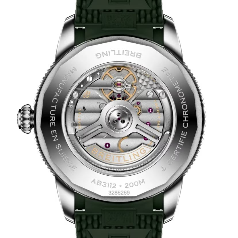 Edelstahl mit dunkelgrüner Keramik-Lünette, dunkelgrünes Kautschukband mit Faltschließe, Automatikwerk Manufakturkaliber Breitling B31, Gangreserve ca. 78 Stunden, Datumsanzeige, Saphirglas, Saphirglas-Sichtboden, Durchmesser 44mm, wasserdicht bis 200m, fünf Jahre Garantie