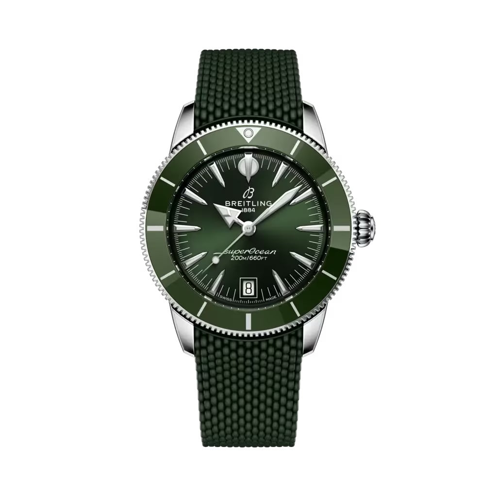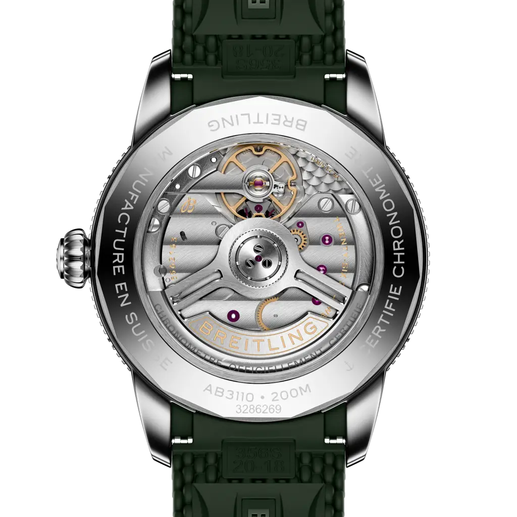 Edelstahl mit dunkelgrüner Keramik-Lünette, dunkelgrünes Kautschukband mit Faltschließe, Automatikwerk Manufakturkaliber Breitling B31, Gangreserve ca. 78 Stunden, Datumsanzeige, Saphirglas, Saphirglas-Sichtboden, Durchmesser 40mm, wasserdicht bis 200m, fünf Jahre Garantie